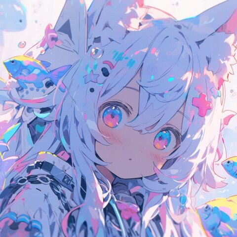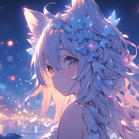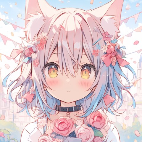 青い髪を風になびかせ、少女はカラフルな風船に囲まれたお祭りの街を歩く。猫耳のようなアクセサリーが揺れ、黄色い瞳に夢のような輝きが宿る。幼い頃の約束を思い出しながら、風船の一つに手を伸ばす彼女。そこには、失われた友との再会を予感させる不思議な世界が広がっていた。風に乗り、空へ舞い上がる瞬間、少女の心は自由に羽ばたく。