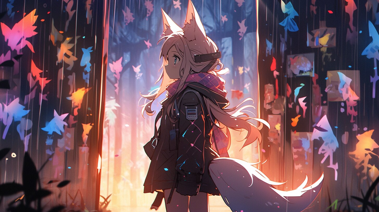 幻想的な森の奥深く、色鮮やかなネオン魚が舞う夜空の下で、狐耳の少女が静かに振り返る。彼女は冒険の旅人か、それとも失われた記憶を探す者か。フードを被った姿が、神秘的な光に照らされ、そこで繰り広げられる物語は、誰も知らない秘密を宿している。優しい風が彼女の尾を揺らし、次の瞬間、何かが始まる予感がする。