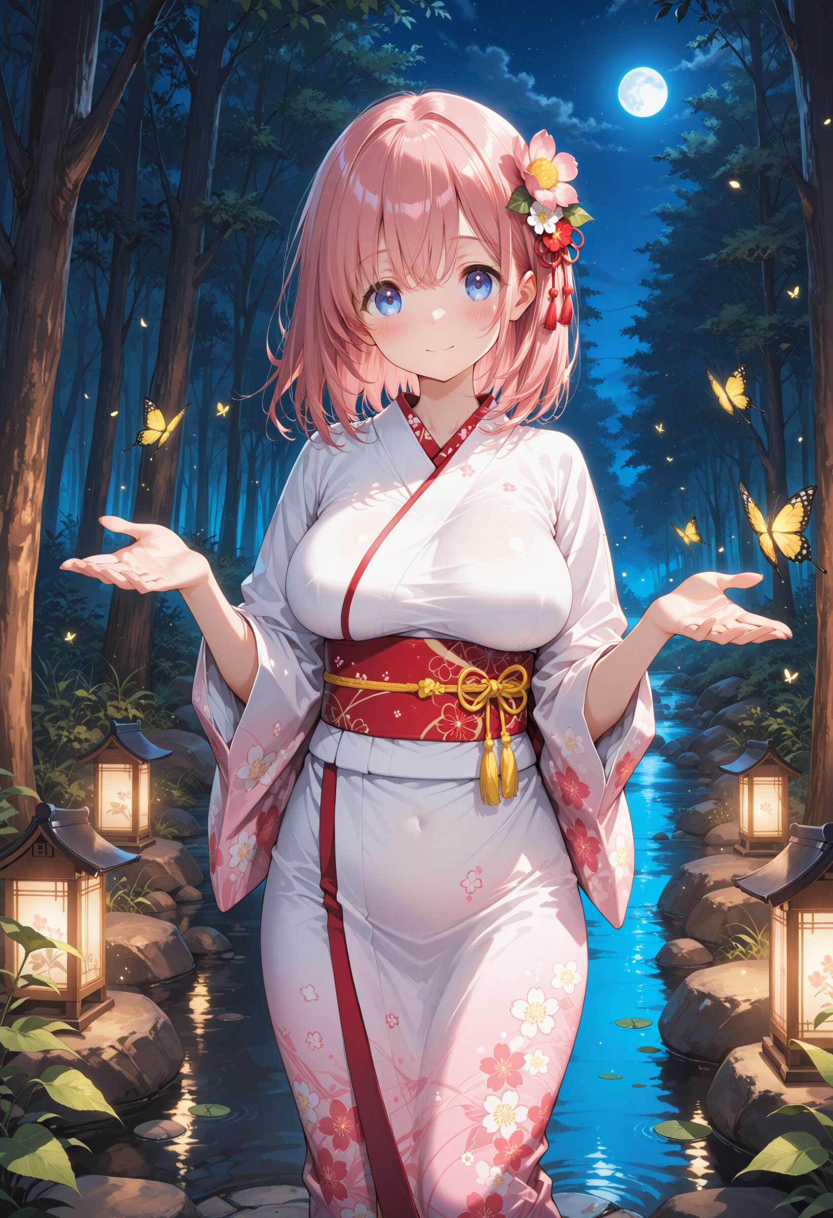 masterpiece, best quality, highres, ultra-detailed, extremely detailed, detailed, 1girl, loli, petite, beautiful pink hair, beautiful blue eyes, medium hair, Flower hair ornament, yukata, spread both hands, big breasts, impossible clothes, perky breasts, ,innocent expression, night, in forest, In the middle of the faintly shining pond, where countless butterflies take flight, shining in light blue and pink., moon light effect, beautiful legs,