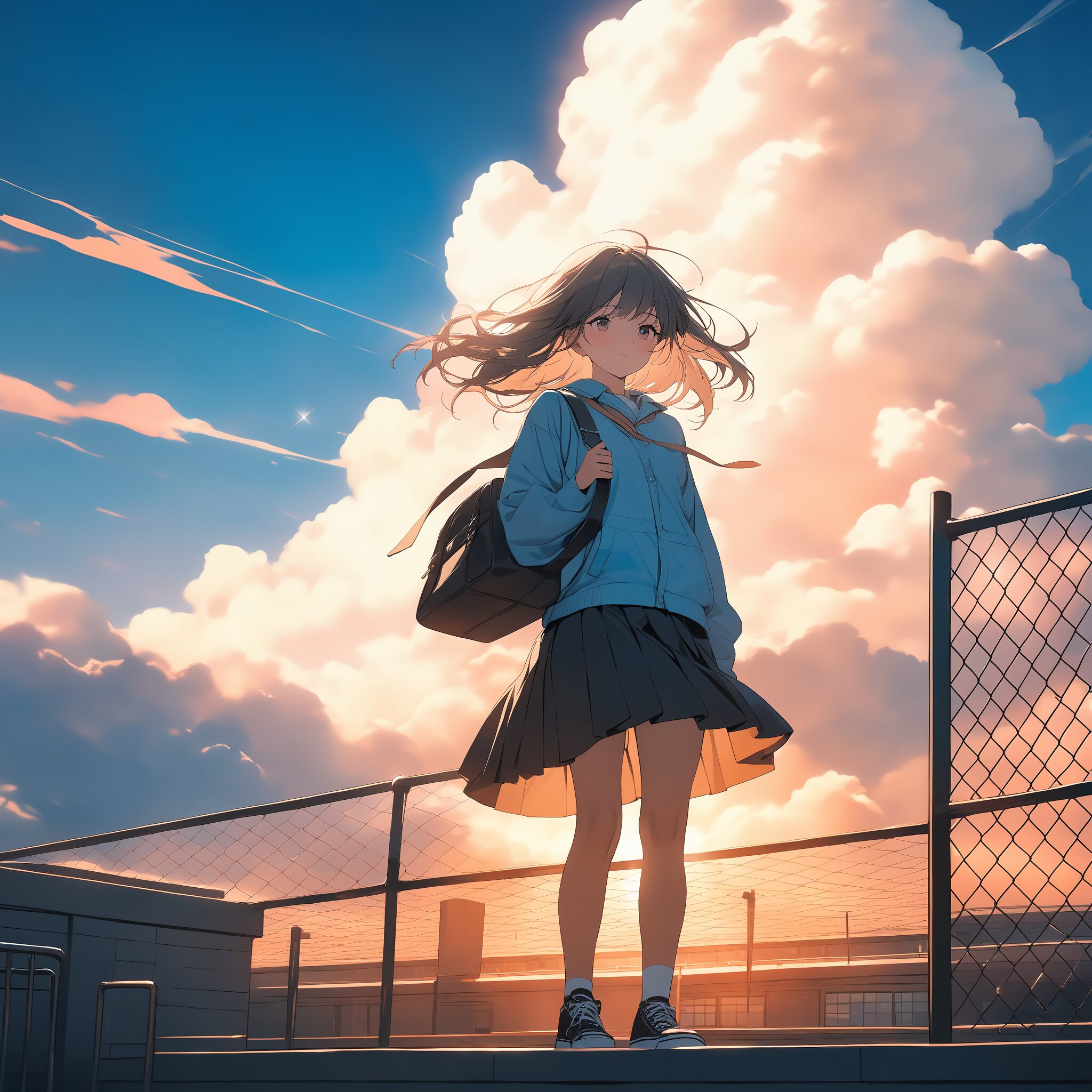 masterpiece, best quality, photorealistic, sharp focus, cinematic lighting, depth of field, beautiful composition, vibrant colors, ultra high res, 8K, highly detailed, masterpiece, best quality, very detailed, Breathtaking wide shot, a high school girl standing by the fence on the school rooftop, dramatic wind blowing through her hair and skirt, huge white cumulonimbus clouds against a vast brilliant blue summer sky, looking towards the horizon with a faint smile, theme of fleeting youth and freedom, vibrant yet soft colors, cinematic lens flare, high quality.