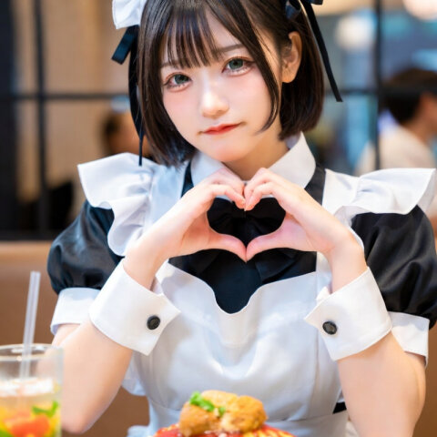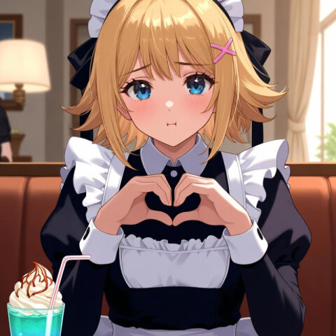 17歳女性のアニメ調イラスト。 銀髪ピンクグラデーションショートボブヘア, ピンクのハート型ヘアピンとピンクのX字ヘアピン, とても大きな瞳, ピンク紫グラデーションの瞳, 照れ笑顔, 少しはにかんだ表情, ぽっちゃり気味の柔らかい体型, 黒いハート型チョーカー, プロのカメラマンによる撮影。黒のアクセントカラーをもつフェミニンな印象を与える白のブラウスと、白黒ストライブのミニ丈のフレアスカートと、黒い太いベルトと、黒のハイソックスを身につけている。春の暖かい自然光、カフェの入り口前。表情はおすまし。
