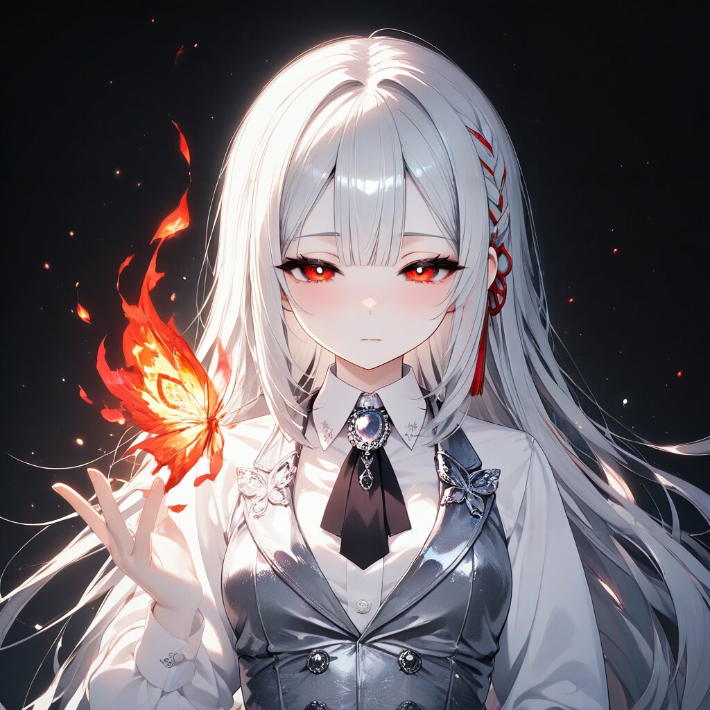 masterpiece, best quality, very aesthetic, newest, year 2024, absurdres, 1girl, elizabeth \(lovecraftian horror\), lovecraftian horror, silver white straight hair, straight bangs, small side braids, deep red eyes, long lashes, porcelain white skin, petite, slender, elegant gothic lolita bartender uniform, pure white dress shirt, black and silver vest, silver brooch, black formal skirt, extreme close-up, close-up, portrait, face focus, silver white long hair, straight bangs, deep red eyes, slanted eyes, dignified expression, cold expression, slightly squinting, calm anger expression, eyes glowing intensely, eyes emitting explosive light, eyes shining with inner flame, eyes overflowing with bright light, light particles of crimson and white radiating from the eyes, geometric light rays, butterfly shaped fiery light, hair glowing with silver light, hair dissolving into light particles, red light reflecting on hair, hair shining under light, black background, deep darkness, dark void, extreme contrast between light and darkness, bloom effect and lens flare, god ray, high contrast, light dominating the frame, mysterious, oppressive, abstract, blinding light, close-up, 1girl, solo, himuro_kochou, petite, small_stature, short_height, slender, child_body, moderately_large_bust, silver_white_hair, deep_crimson_eyes, tsurime, long_straight_hair, side_braid, expressionless, dignified_expression, mysterious_aura, elegant, ageless, pale_skin, porcelain_skin, dark, late night, masterpiece, very aesthetic, 1girl, solo, nsfw, long hair, looking at viewer, blush, hair ornament Negative prompt: worst quality, low quality, normal quality, lowres, old, early, oldest, very displeasing, displeasing, bad anatomy, bad hands, bad feet, extra digits, fewer digits, missing fingers, disfigured, deformed, signature, username, logo, watermark, text, artist name, copyright name, censored, bar censor, mosaic censoring, out of frame, cropped, multiple views, comic, 2koma, 4koma, jpeg artifacts, compression artifacts, blurry