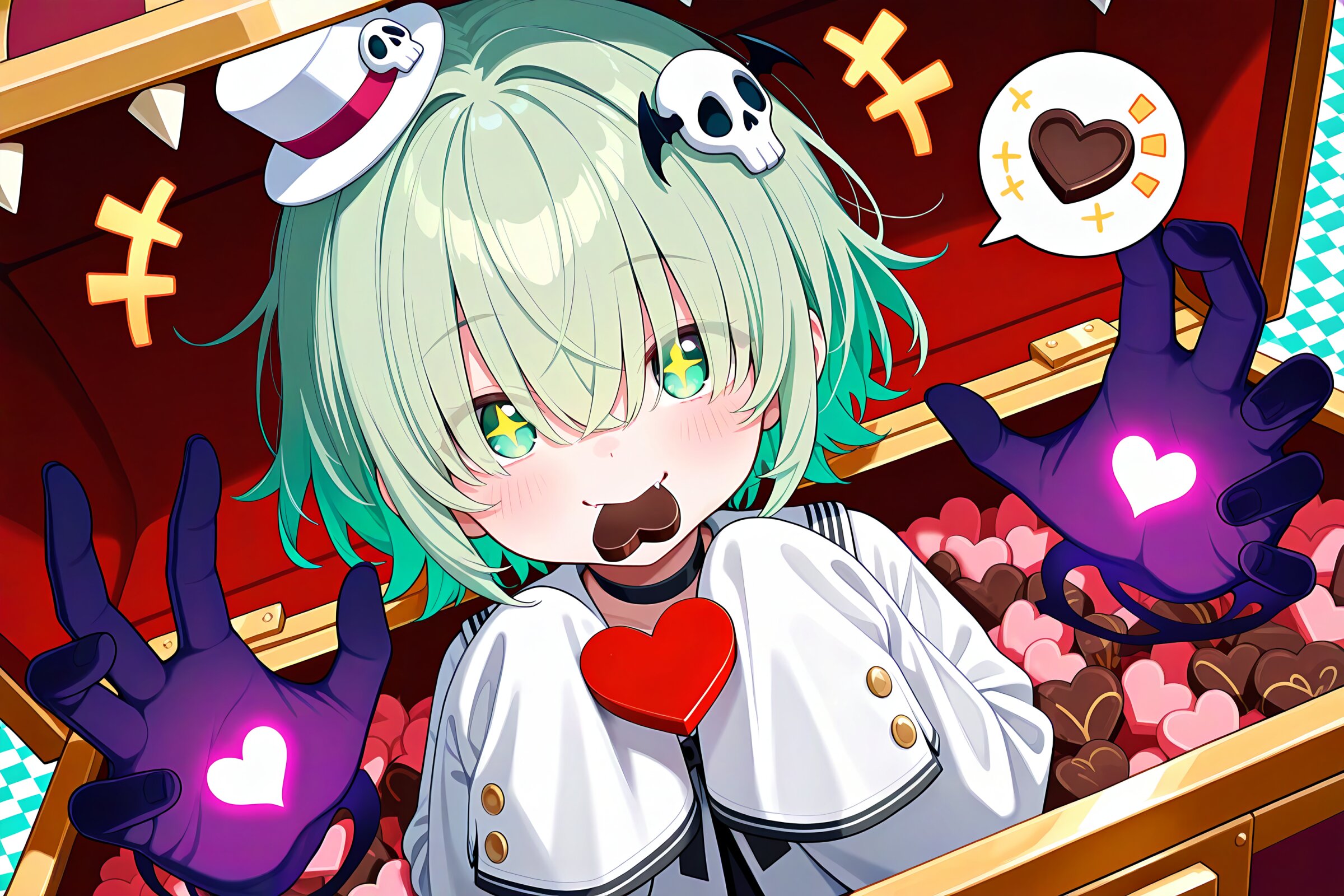 1 little girl, solo, diagonal angle, masterpiece, best quality, amazing quality, very aesthetic, cobalt green hair, short hair, messy hair, (hair over eyes:1.2), green eyes, demon fangs, +_+, smile, cheerful, +++, notice lines, choker, white tuxedo, white mini top hat, (oversized sleeves:1.2), sleeves past wrists, sleeves past fingers, skull hair ornament, in mimic chest, arms up, (floating black ghosty hands:1.2), holding heart-shaped chocolate with her mouth, eating, spoken food, fed by viewer, pink checkered background,