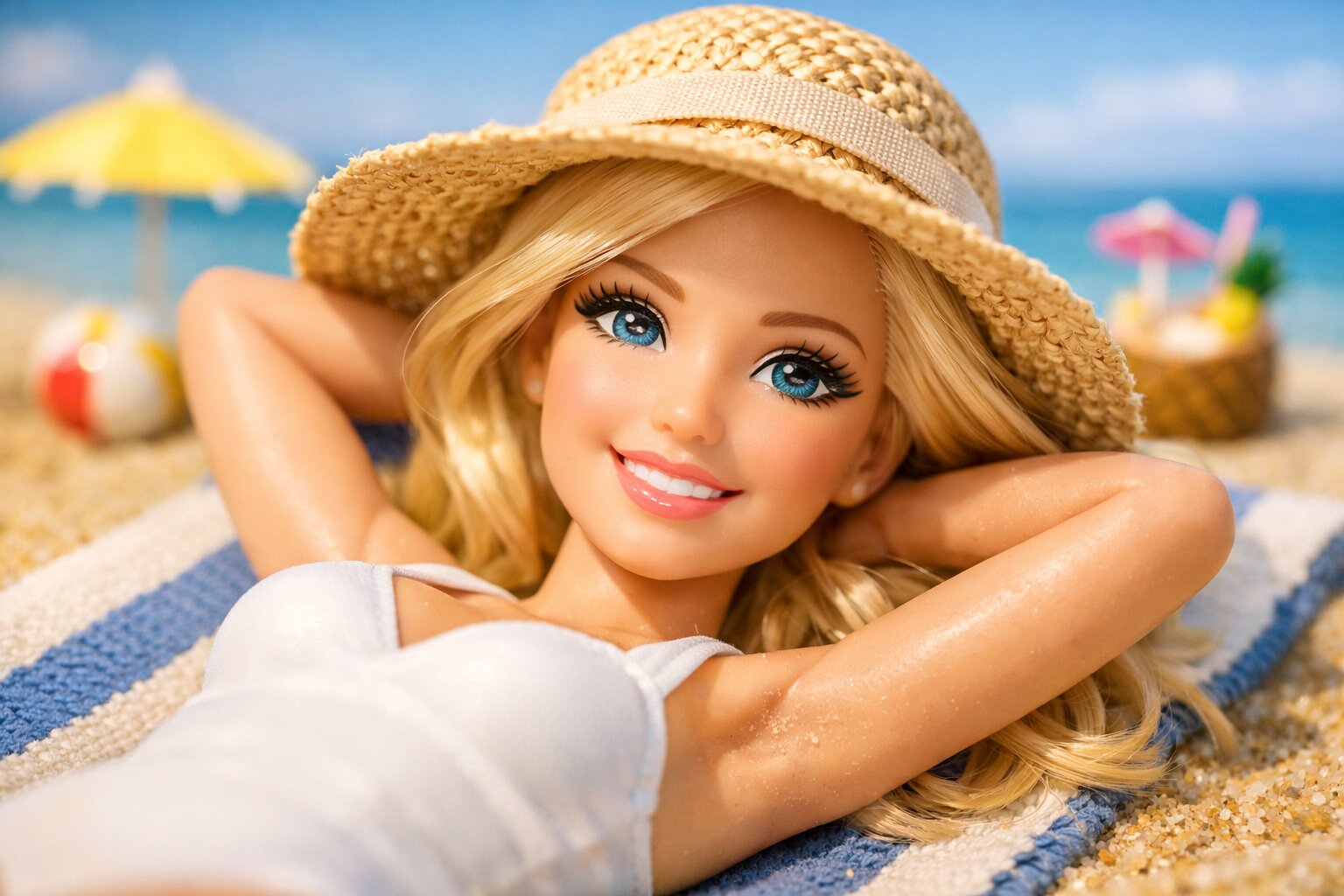 Masterpiece, Best Quality, Amazing Quality, Very Aesthetic, High Resolution, Ultra-Detailed, Absurdres, Newest, Scenery, 3D, Rendered, General, 1girl, doll, toy doll, (doll joints:1.2), miniature, diorama, glossy_skin, plastic_skin, toy_photography, female_focus, solo, small_breasts, blonde_hair, long_hair, blue_eyes, smile, looking_at_viewer, lying on_back, arms_behind_head, close-up, upper_body, cowboy_shot, reclining, one-piece_swimsuit, white_swimsuit, straw_hat, sun_hat, beach_towel, beach, sand, ocean, seaside, summer, outdoors, daylight, parasol, depth_of_field, bokeh, realistic, macro, soft_lighting, high_detail, relaxed, cheerful, healing, aesthetic, cute, Cinematic_Lighting, BREAK, Depth_of_Field, Volumetric_Lighting,