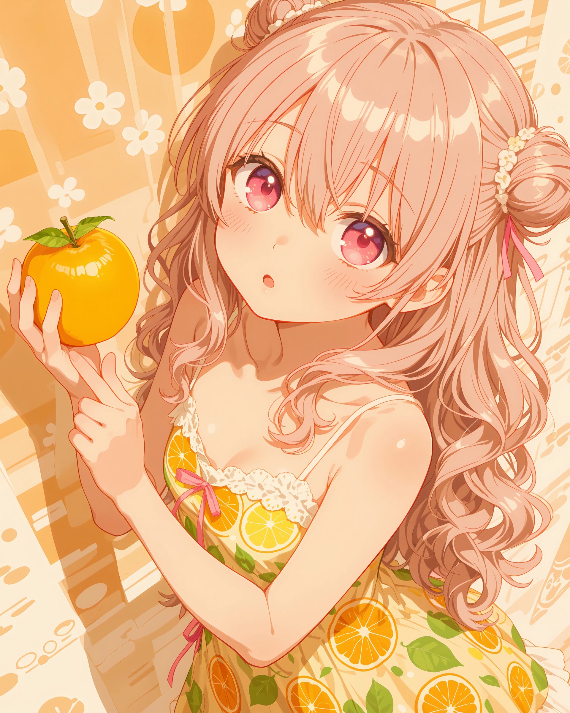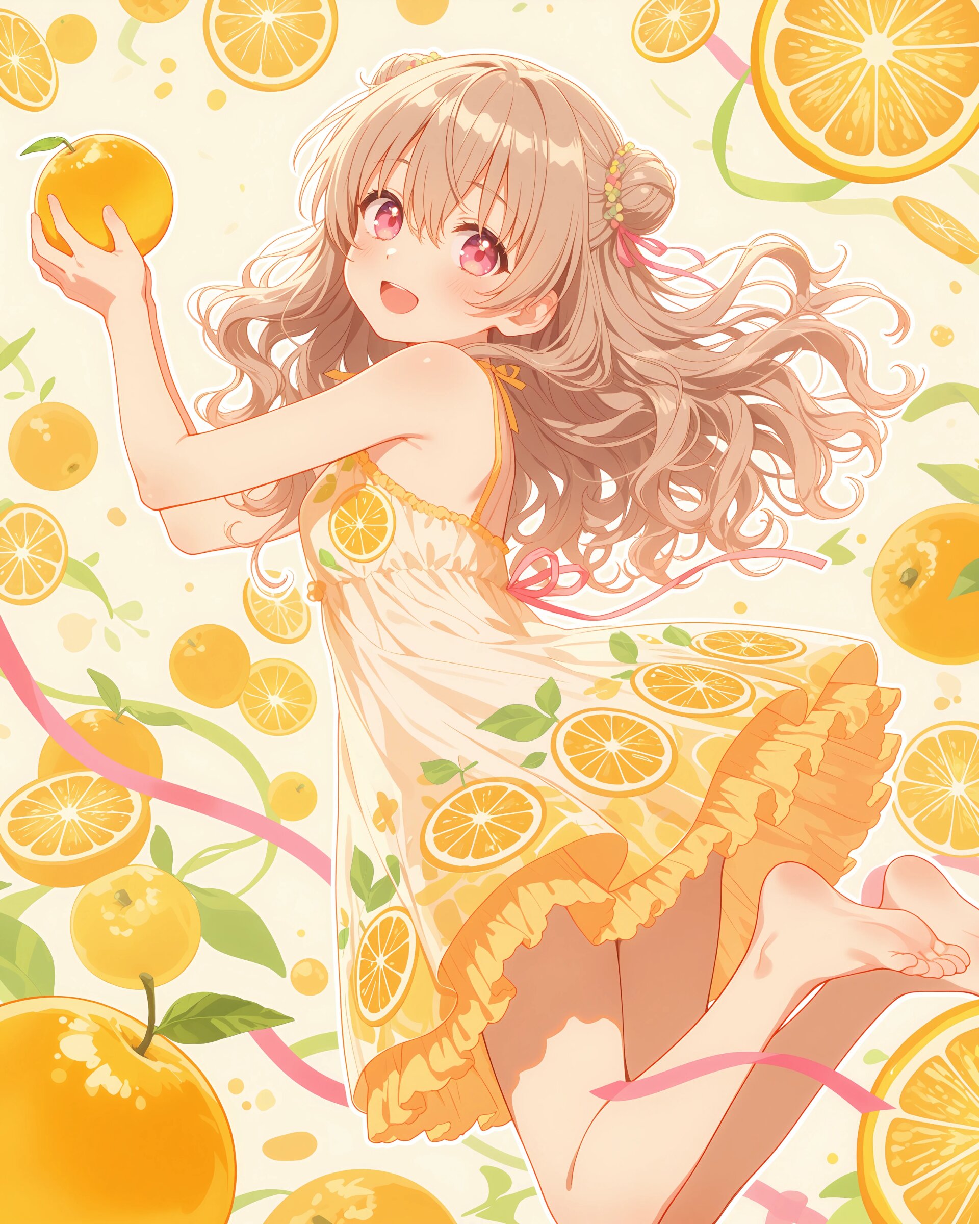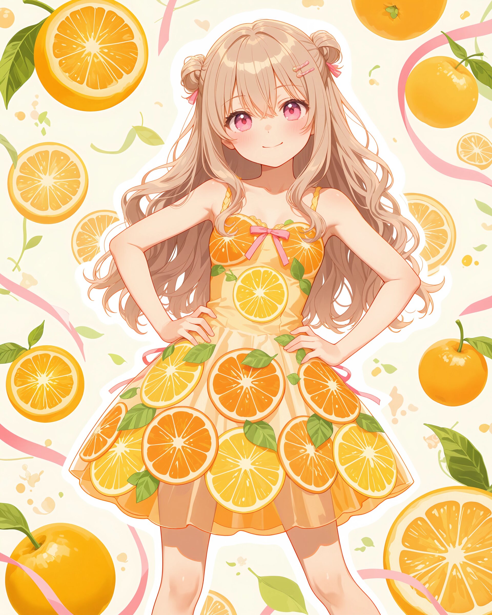 1girl, solo, colorful, from front, feet out of frame, A girl in a citrus-themed dress, bright orange and yellow palette, round citrus patterns, holding a fresh dekopon fruit, refreshing spring atmosphere, clean and vibrant anime illustration, (cute girl, pink eyes, cute eyes, large eyes, pink ribbon, light brown hair, medium long wavy hair, two small buns, bangs between eyes, bobby pin, small breasts), blush, looking at viewer, smile, closed mouth, standing with legs apart, hands on hips, heroic pose, clean lineart, delicate outline, clear silhouette, masterpiece, best quality, newest, absurdres, highres, very awa,