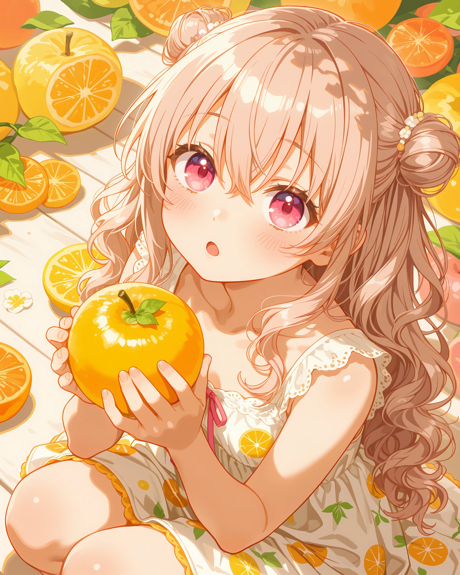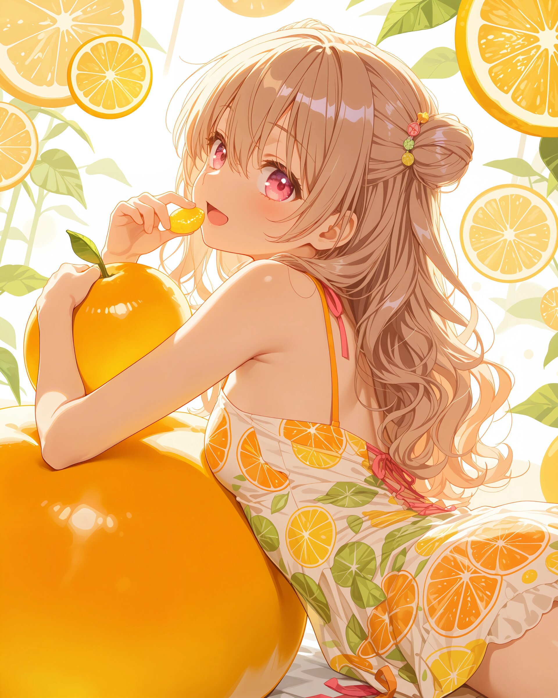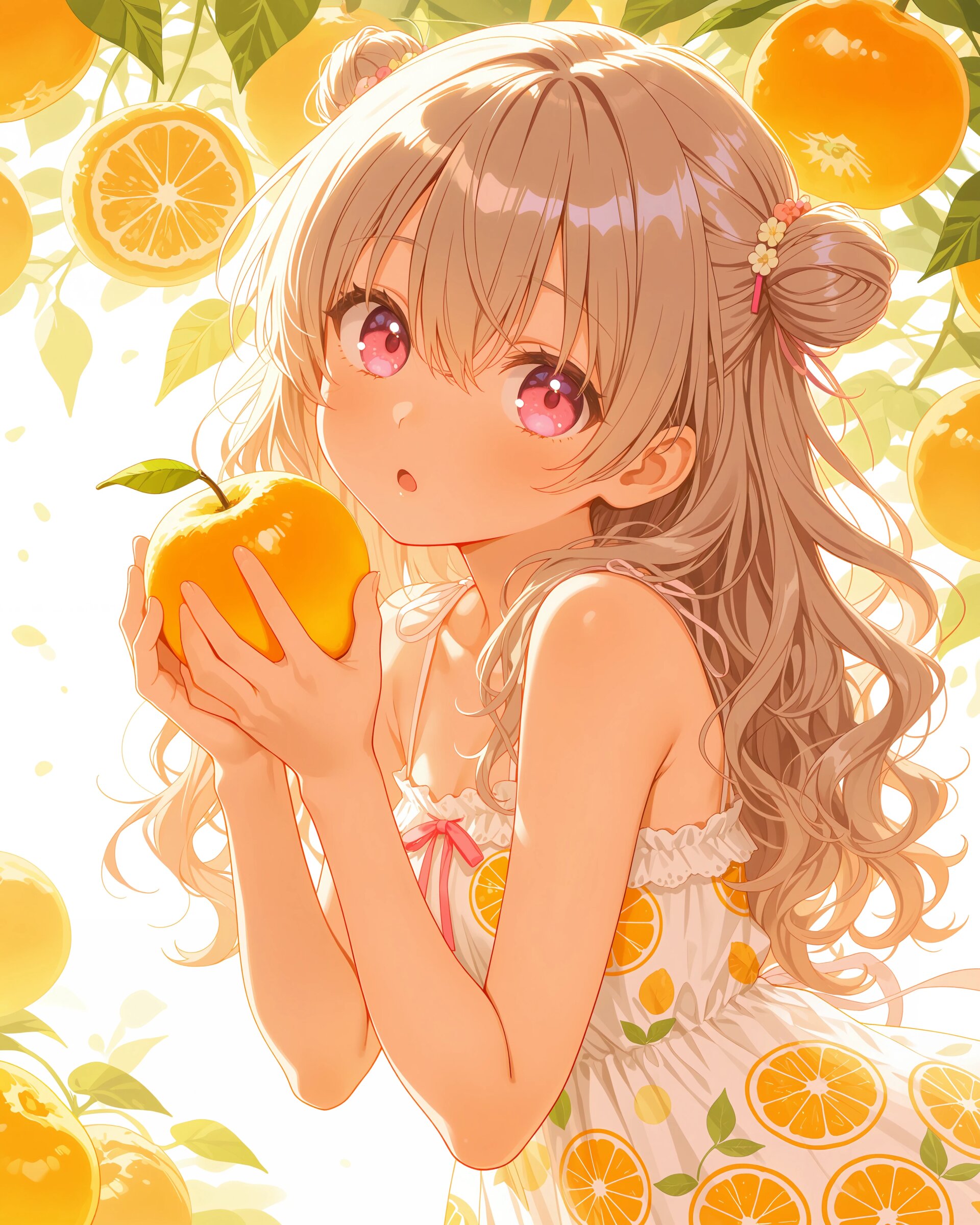 1girl, solo, colorful, from front, feet out of frame, A girl in a citrus-themed dress, bright orange and yellow palette, round citrus patterns, holding a fresh dekopon fruit, refreshing spring atmosphere, clean and vibrant anime illustration, (cute girl, pink eyes, cute eyes, large eyes, pink ribbon, light brown hair, medium long wavy hair, two small buns, bangs between eyes, bobby pin, small breasts), blush, looking at viewer, smile, closed mouth, standing with legs apart, hands on hips, heroic pose, clean lineart, delicate outline, clear silhouette, masterpiece, best quality, newest, absurdres, highres, very awa,