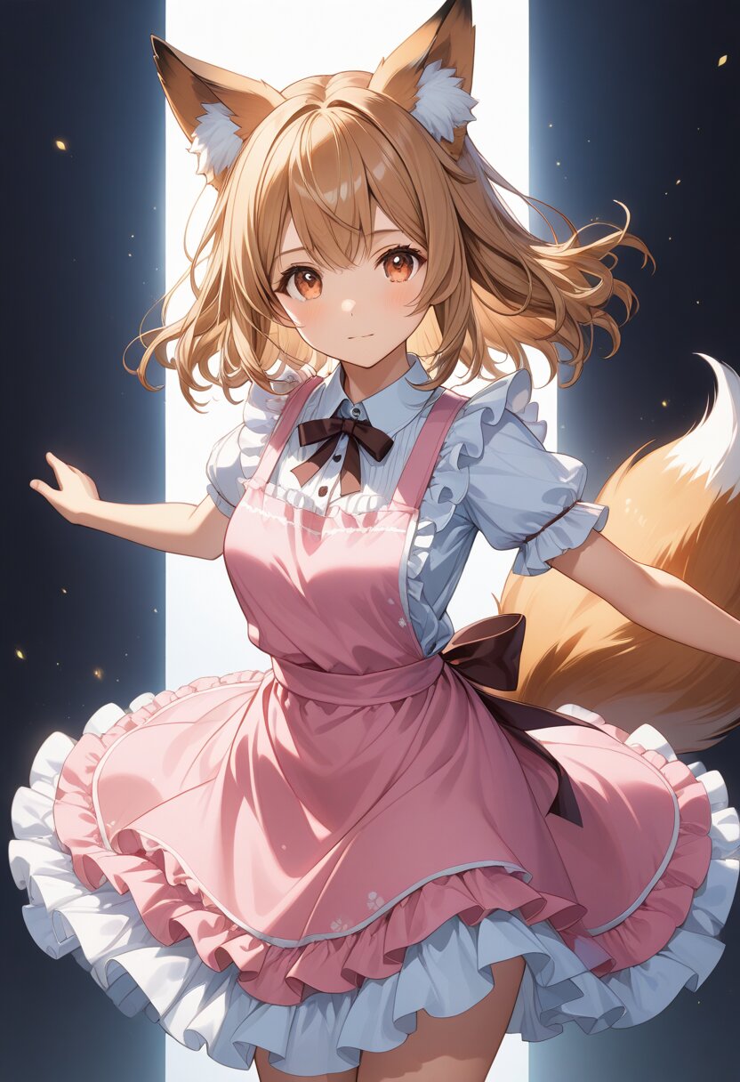 (high resolusion,illustration,ultra detailed 8k art,extremely detailed CG,official art,clothes reflecting light,detailed shiny skin,detailed background:1.3), ((highly detailed beautiful face and eyes),anime_style, fox_ears, girl, light_brown_hair, double_eyelids, long_eyelashes, fluffy_tail, pink_apron_dress, frill_blouse, many_frills, frills, apron, standing_pose, full_body, simple_background, monochrome_background, knee_socks, arms_outstretched, clear_outline, red_eyes, soft_lighting, expressive_eyes