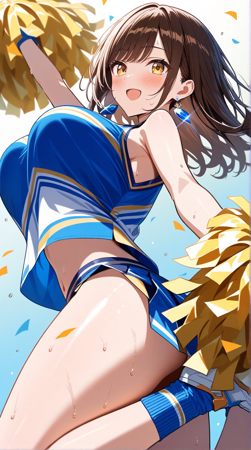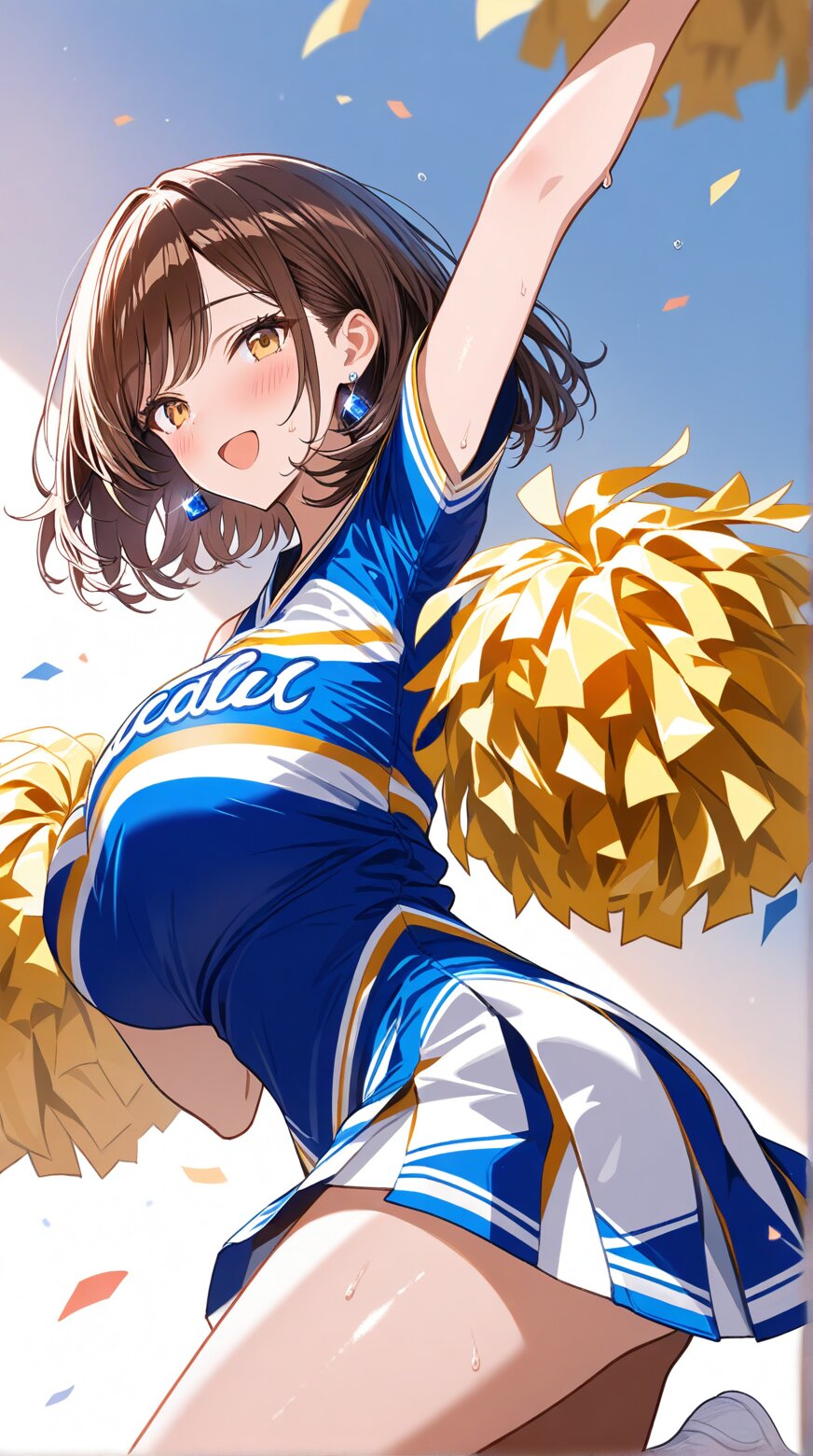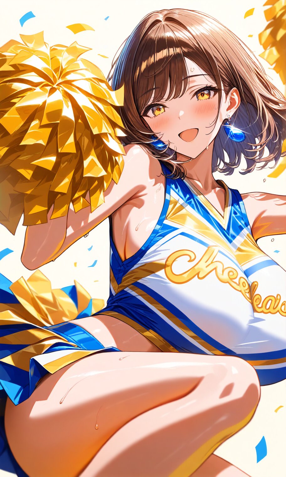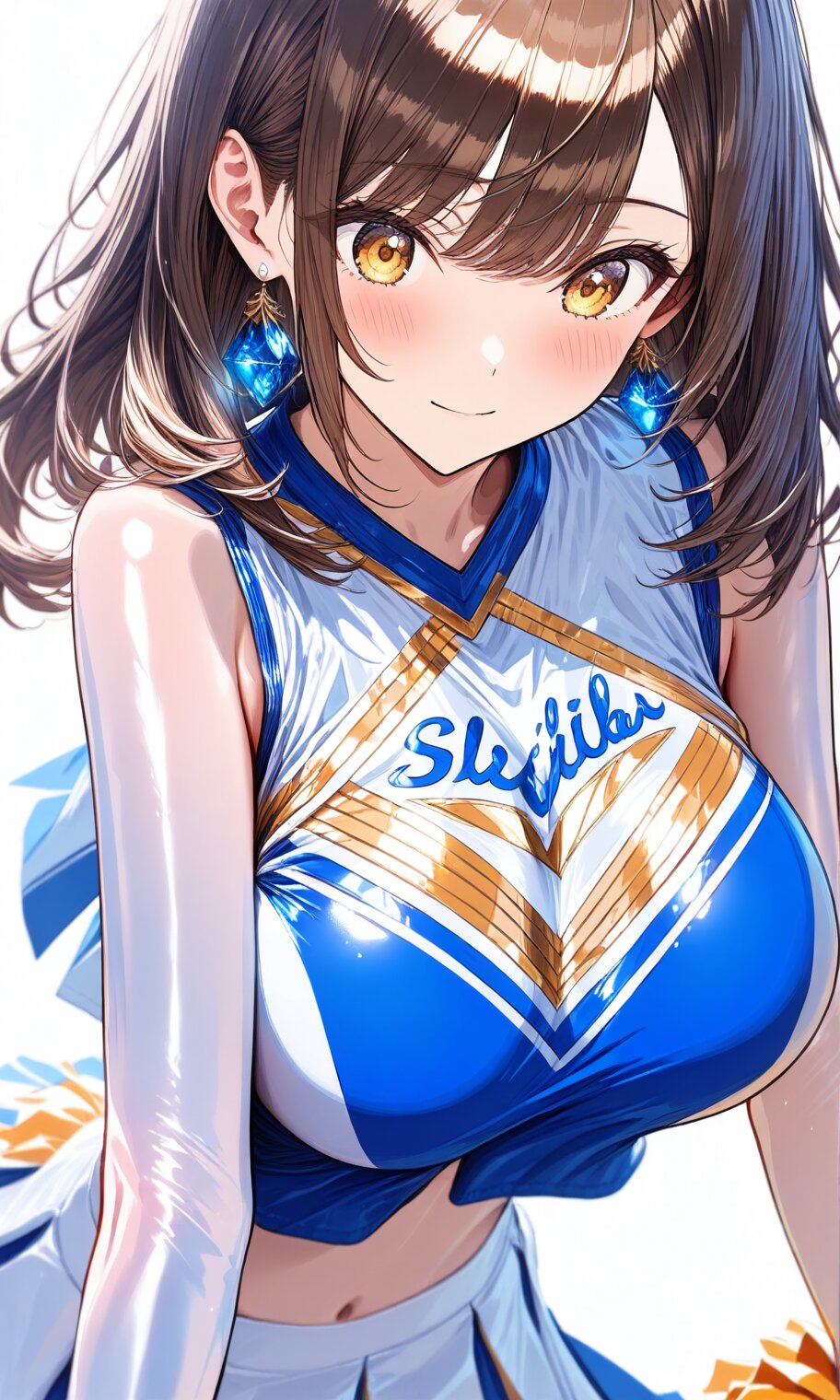 1girls,masterpiece,best quality,super detail,high details,highres,detailed glossy skin texture with shine, solo,brown hair,golden eyes,female,adult,shoulder length hair,glossy hair,blue gemstone earrings,big breasts,blush,;d,slight smile, toe,((full_shot:1.1)),white_background,cheerleader,cheerleading dance,sweat,