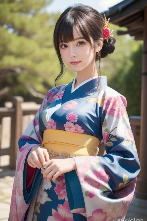 masterpiece, hyper detailed, 8k, realistic, upper body, japanese woman, 23yo, cute, pretty, hyper detailed face, hyper detailed eyes, beautiful eyes, hime cut, medium hair, bangs, thin body, thin waist, tall, large bouquet, (colorful kimono:1.2), hyper detailed,