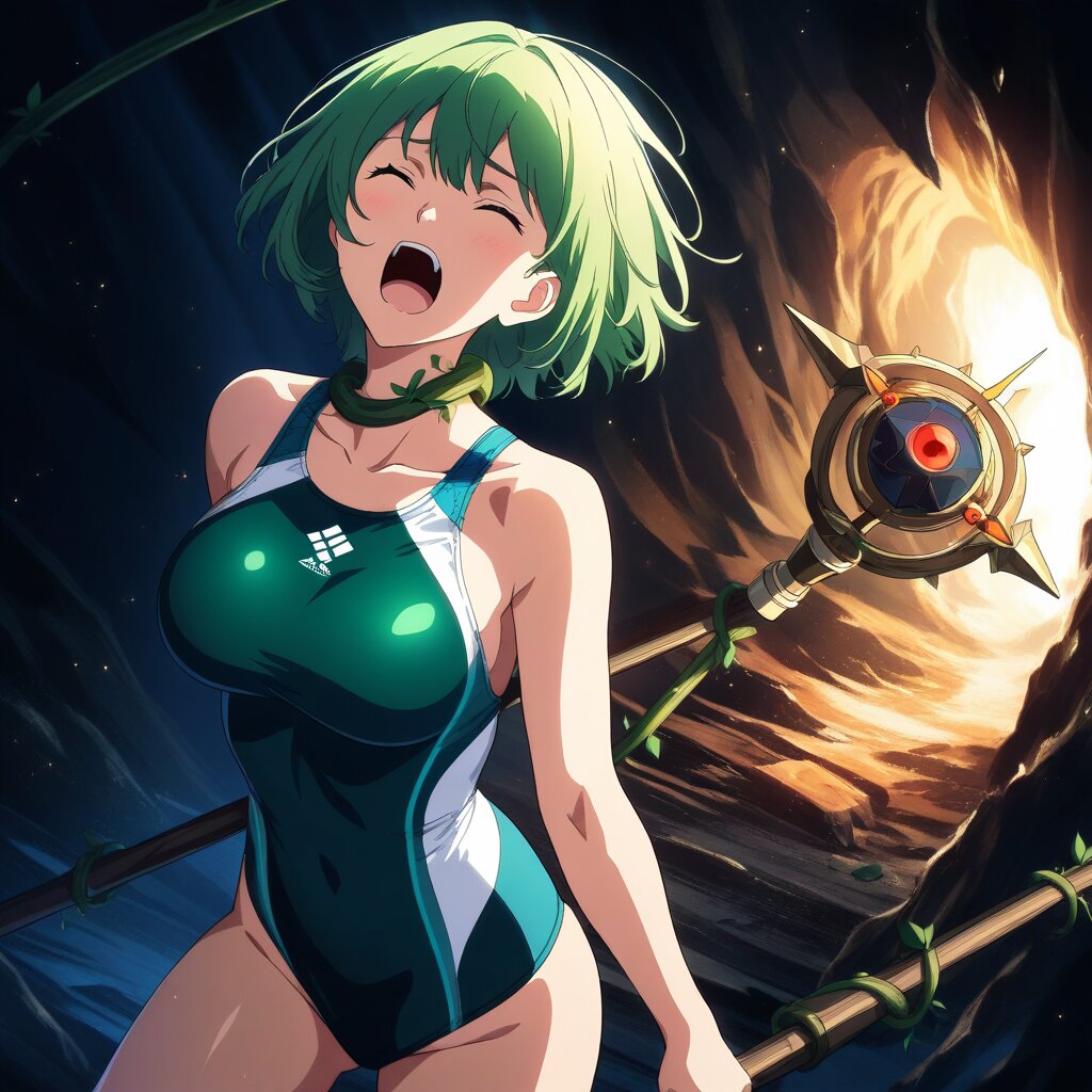((masterpiece)), ((best quality)), (ultra-detailed), anime style,cowboy shot, Dark cave,(green competition swimsuit),a cute girl,large bust,vines strangle her neck, short hair, green hair, Holding a weapon in hand, gripping staff,(closed eyes), (screaming),painful face,strangle her neck