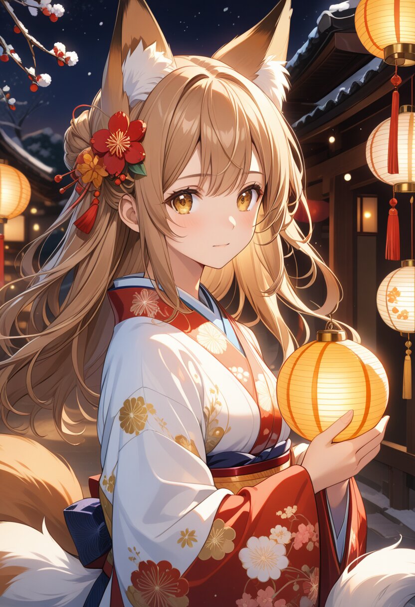 (high resolusion,illustration,ultra detailed 8k art,extremely detailed CG,official art,clothes reflecting light,detailed shiny skin,detailed background:1.3), ((highly detailed beautiful face and eyes),anime_style, fox_ears, girl, light_brown_hair, double_eyelids, long_eyelashes, fluffy_tail, new_year_theme, traditional_japanese_motif, festive_atmosphere, soft_lighting, expressive_eyes, delicate_features, charming_scene, warm_color_palette