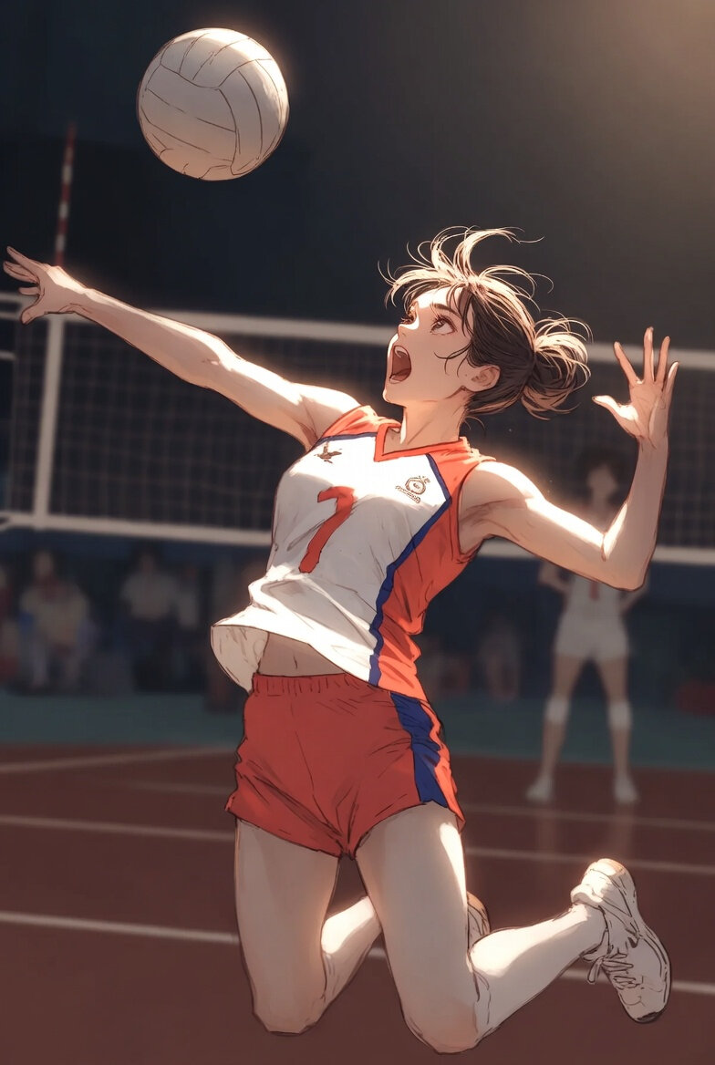 日本人女性15歳のデジタルイラスト。バレーボールのユニフォームを着ている。ボールをアタックした直後のシーン。