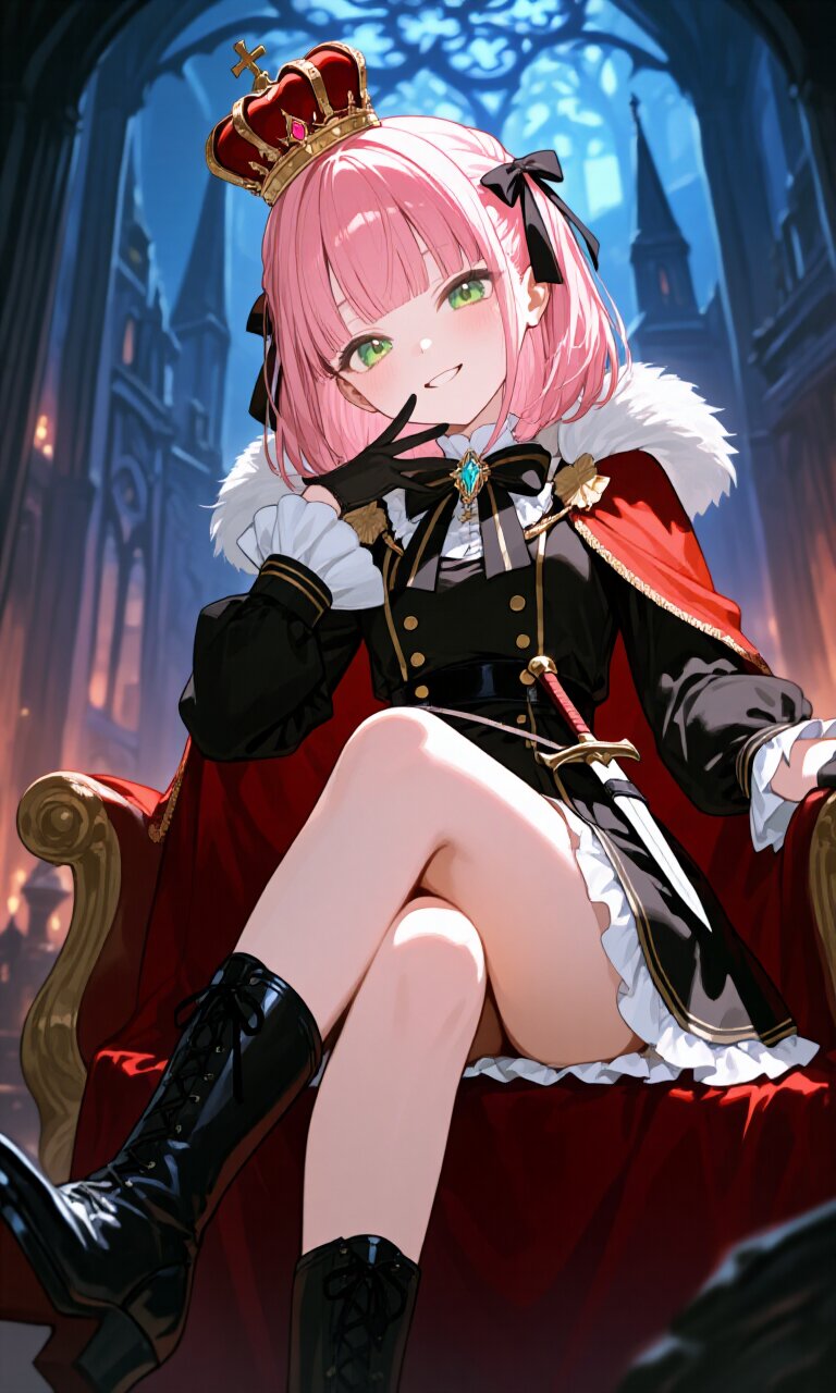 A 15-year-old girl with a cute, delicate, and beautifully detailed face sits on a luxurious chair in a grand palace with gothic architecture. She has striking green eyes and pink hair styled in a bob cut with blunt bangs, adorned with a hair ribbon. She wears a (Black luxurious prince costume:1.4) with a (Darkred luxurious cape:1.2), a (Black luxurious mini skirt with white trim:1.4), long sleeves with white cuffs, and (luxurious Black gloves:1.2). A thin ribbon accents her high neck, and a (dagger on waist:1.3) adds a touch of danger. Atop her head rests a (luxurious crown on head:1.2), completing her regal yet playful look. Her (luxurious Black Boots:1.3) gleam under the soft lighting as she gives a (naughty smile:1.3). The background features intricate gothic details, bathed in the glow of nighttime bloom lighting, creating a fantasy-filled, romantic academia atmosphere with gothic lolita influences. The style is highly detailed, with outstanding intricacies and anti-aliasing for a polished finish.