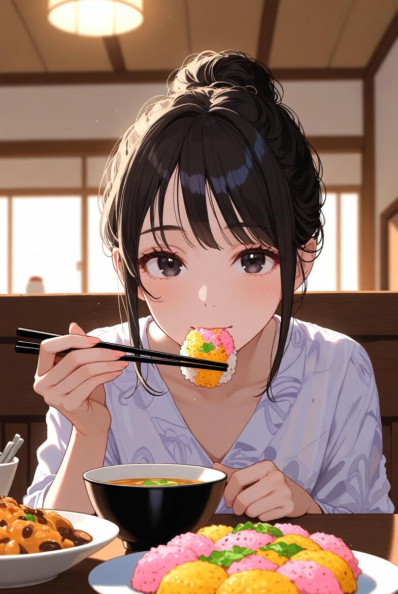自宅で夕食をとっている日本人女性25歳のイラスト。3月3日はひな祭りなので、ちらし寿司を楽しんでいる。