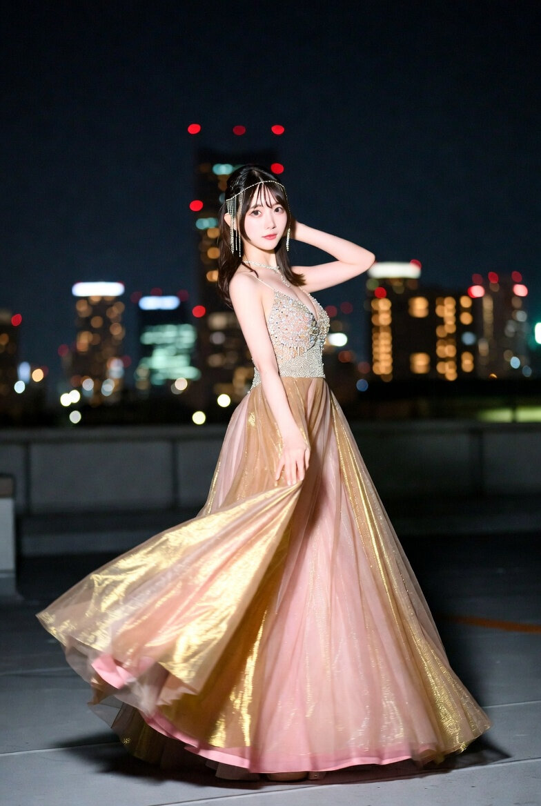 日本人女性24歳のリアルな写真。パーティードレスを身に付けている。ワンピースで裾が軽やかに拡がっている。ゴールドピンクの色。服や頭に輝くアクセサリー。夜のビルの屋上にて、プロのカメラマンによる撮影