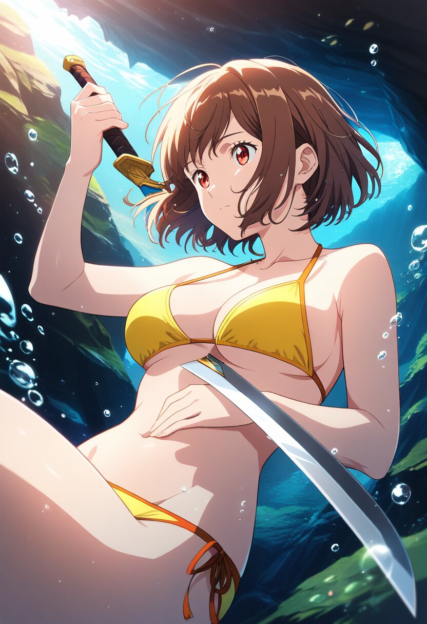 ((masterpiece)), ((best quality)), (ultra-detailed), anime style,cowboy shot, cave, a cute girl, (yellow bikini),large bust, beautiful brown hair, beautiful red eyes, ((beautiful eyes)), ((short hair)), Holding a weapon in hand, gripping Sword,swimming, on back,diving underwater,hair floating freely, relaxed pose, small bubbles