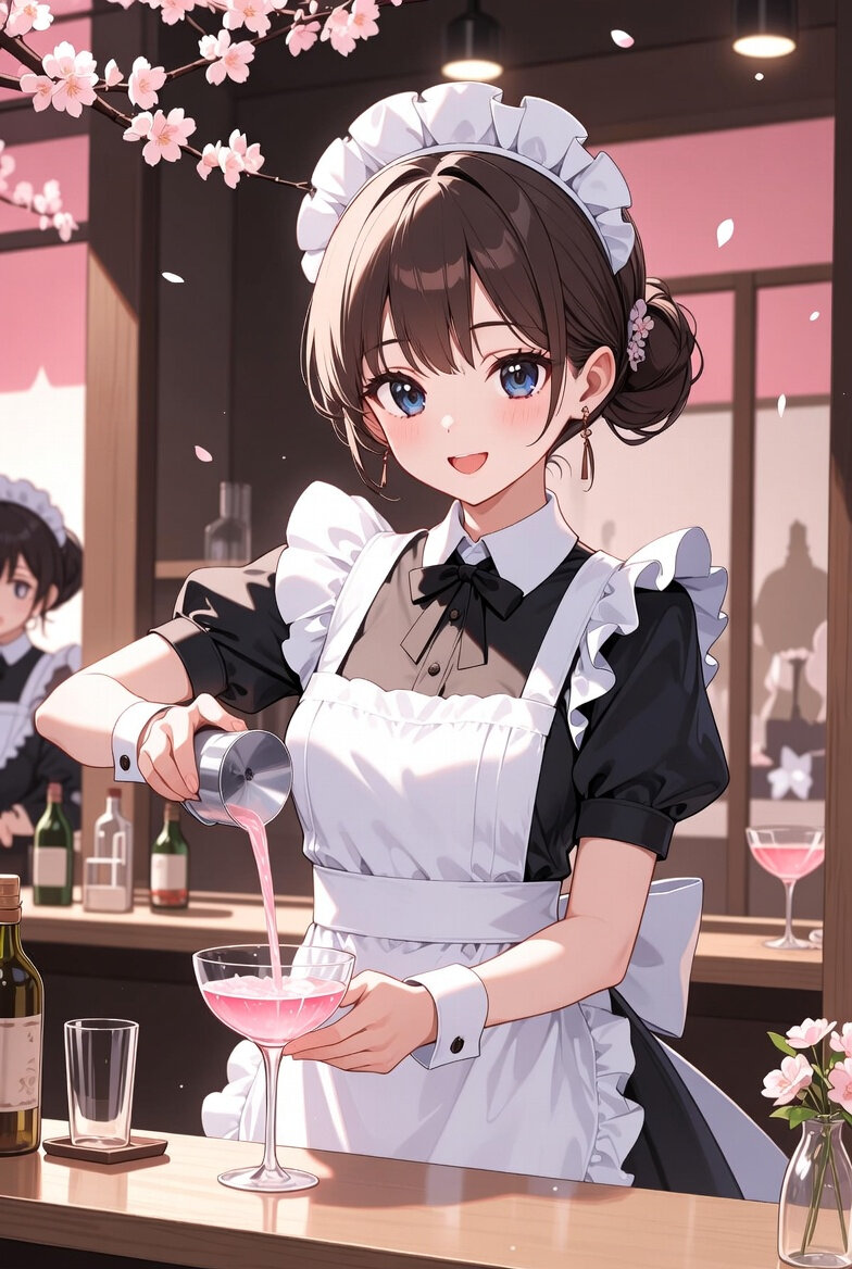 イラスト。日本人女性20歳。メイドバーに給仕するメイドさんの衣裳を着ている。ひな祭りのイベントで、桜色のカクテルをつくってカウンターに出している。