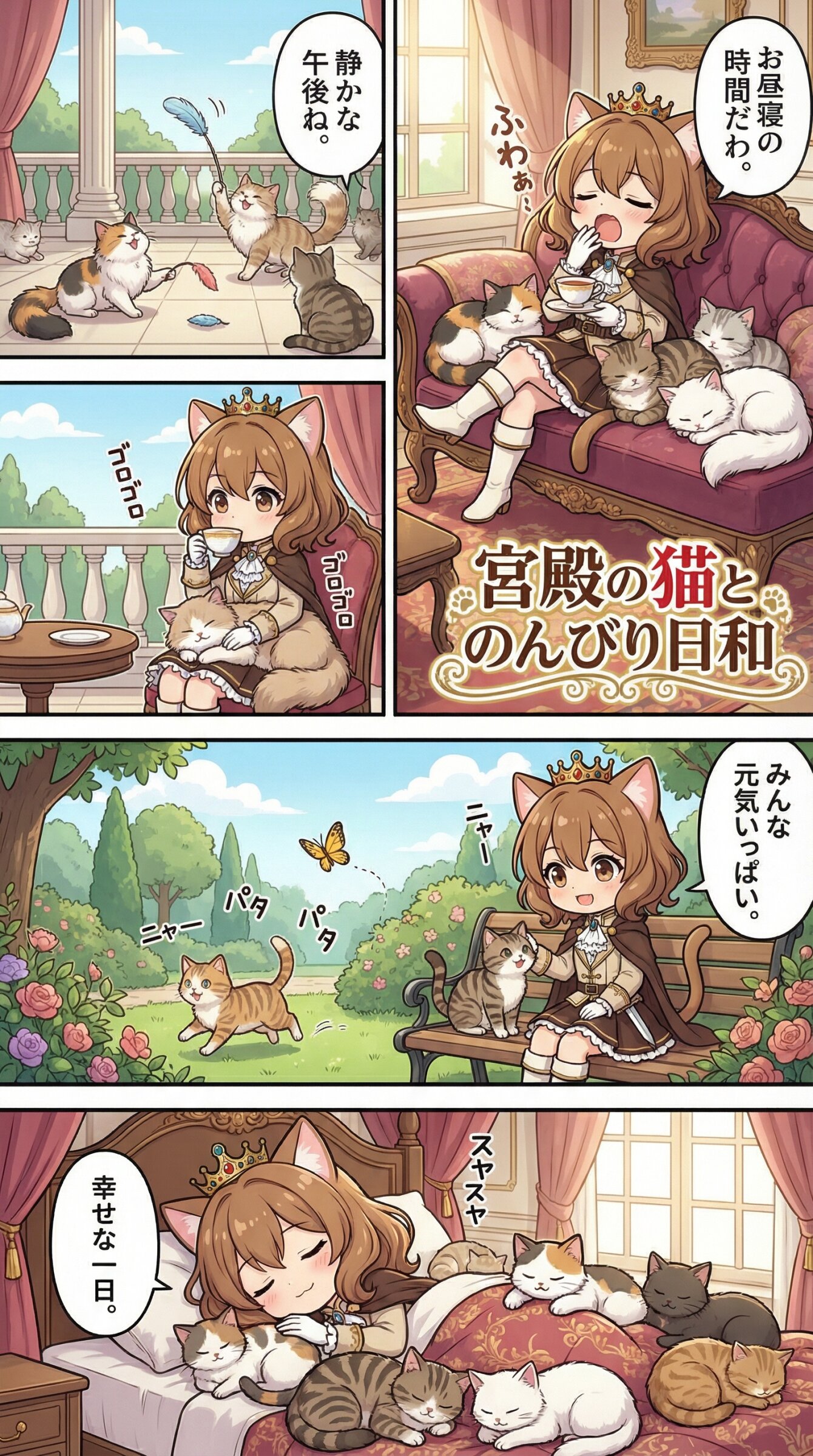 Use the uploaded image as the absolute visual reference for the character's face,ears, and natural cat tail. Do not deviate from the original design. 宮殿でくつろぐ、ユニークな短編カラー漫画を作って。 可愛い猫ちゃんたちと一緒。 平和な日常を送っている。 セリフやオノマトペはすべて日本語。 右から左へ読むことを前提としたセリフ、それに合わせたキャラ配置、コマ配置。 内容に合ったタイトルをつける。 タイトルは内容に沿ったデザインの飾り文字とする。 タイトルは1コマ目内の右下か左下に配置する。 アスペクト比9:16。