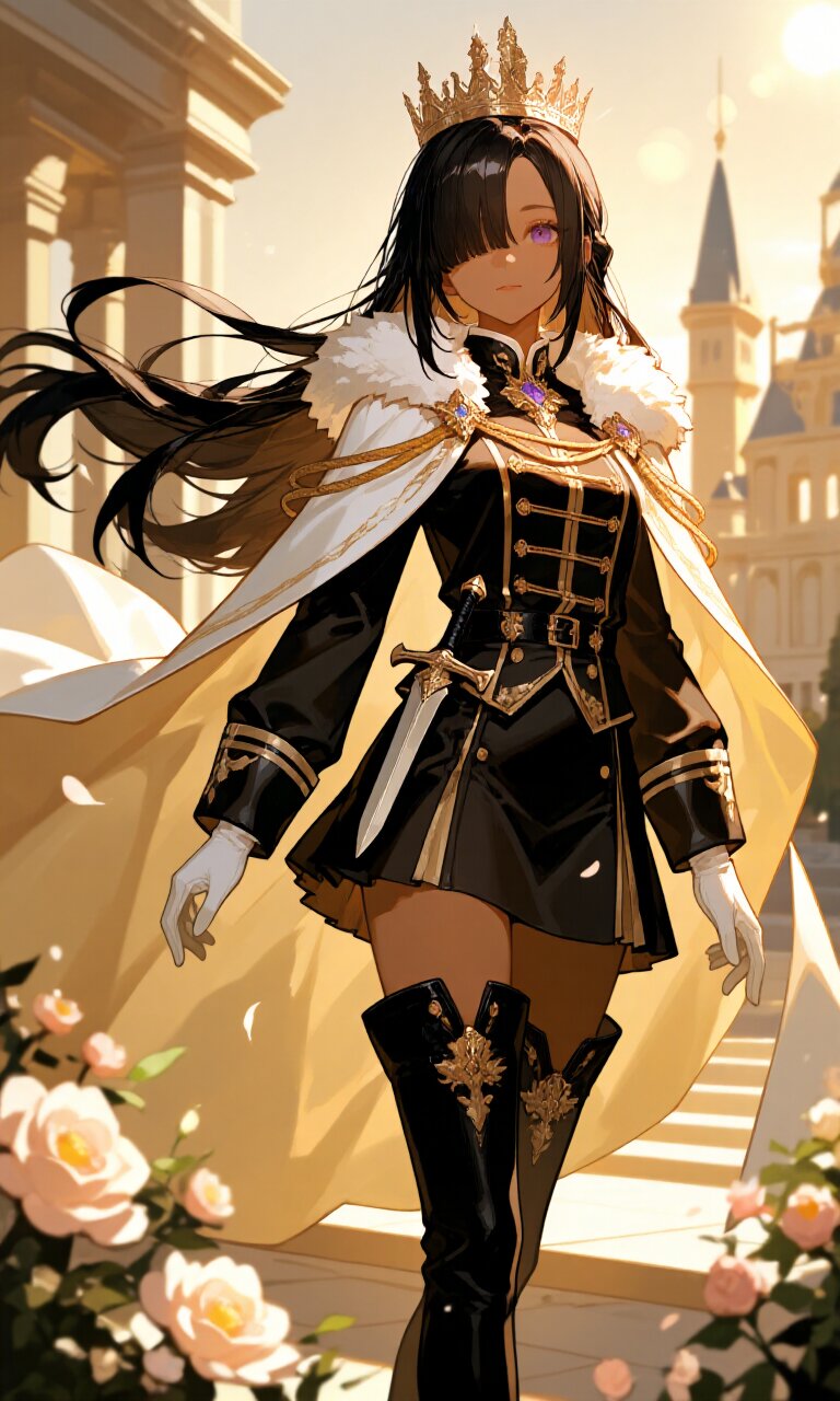 A stunningly detailed masterpiece in (traditional media:1.5) with a warm (sepia:1.8) tone, featuring an 18-year-old girl with tall stature and delicate olive skin. She has striking purple eyes and long, straight black hair styled with (Hair over the right eye:1.2) and sideburns, exuding elegance. Her face is beautifully detailed with faint lips and a happy, neutral expression, radiating charm. She wears a (luxurious Black Prince costume:1.6) with long sleeves, paired with a (luxurious White Cape:1.3) flowing dramatically behind her. The outfit includes a (luxurious Black mini skirt:1.4), (luxurious Black Boots:1.3), and (luxurious White gloves:1.3), all intricately designed. A (dagger on waist:1.3) and a (luxurious crown on head:1.4) complete her regal look. She stands in a grand Palace with modern architecture, surrounded by blooming flowers in the evening sunlight. The atmosphere is light and romantic, blending classic and romantic academia aesthetics. Warm lighting enhances the scene, with lens flares adding a dreamy touch. The composition is insanely detailed, capturing every delicate strand of hair, fabric texture, and the soft glow of the setting sun.