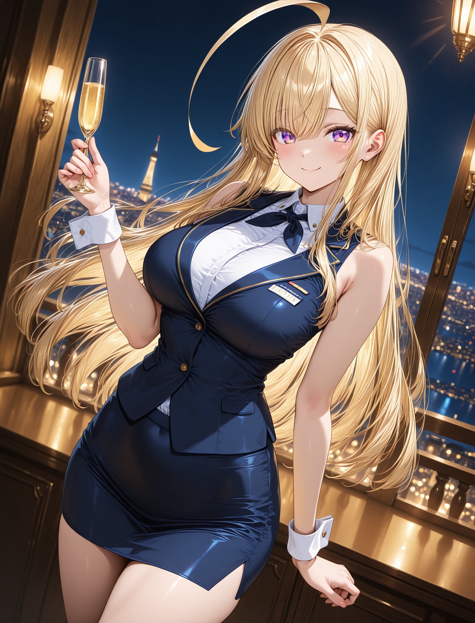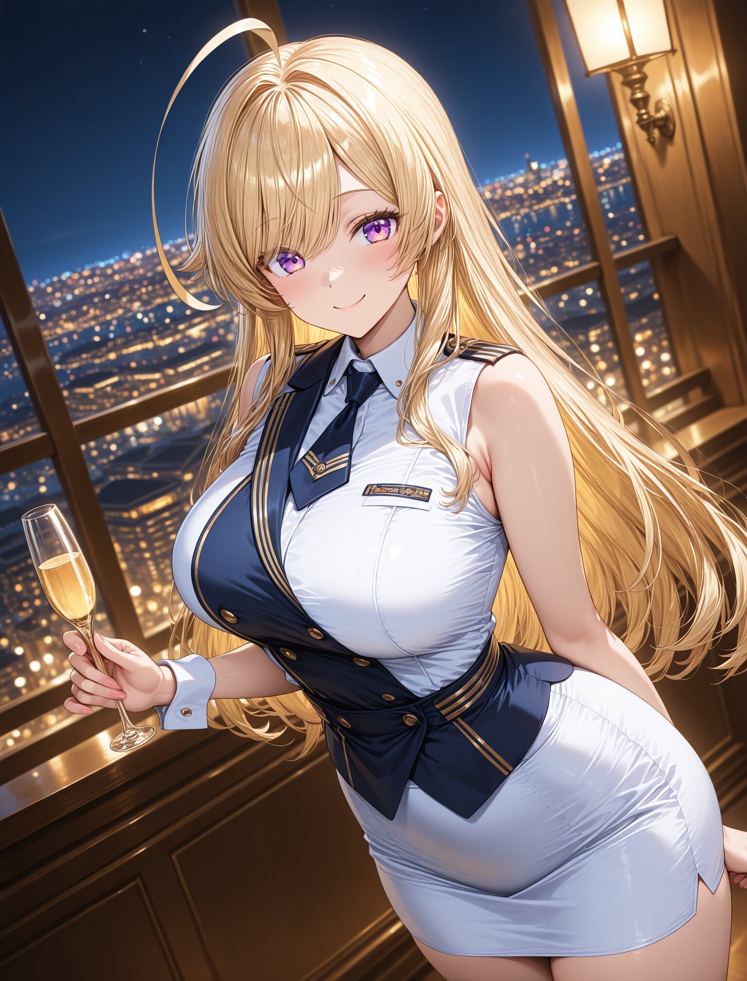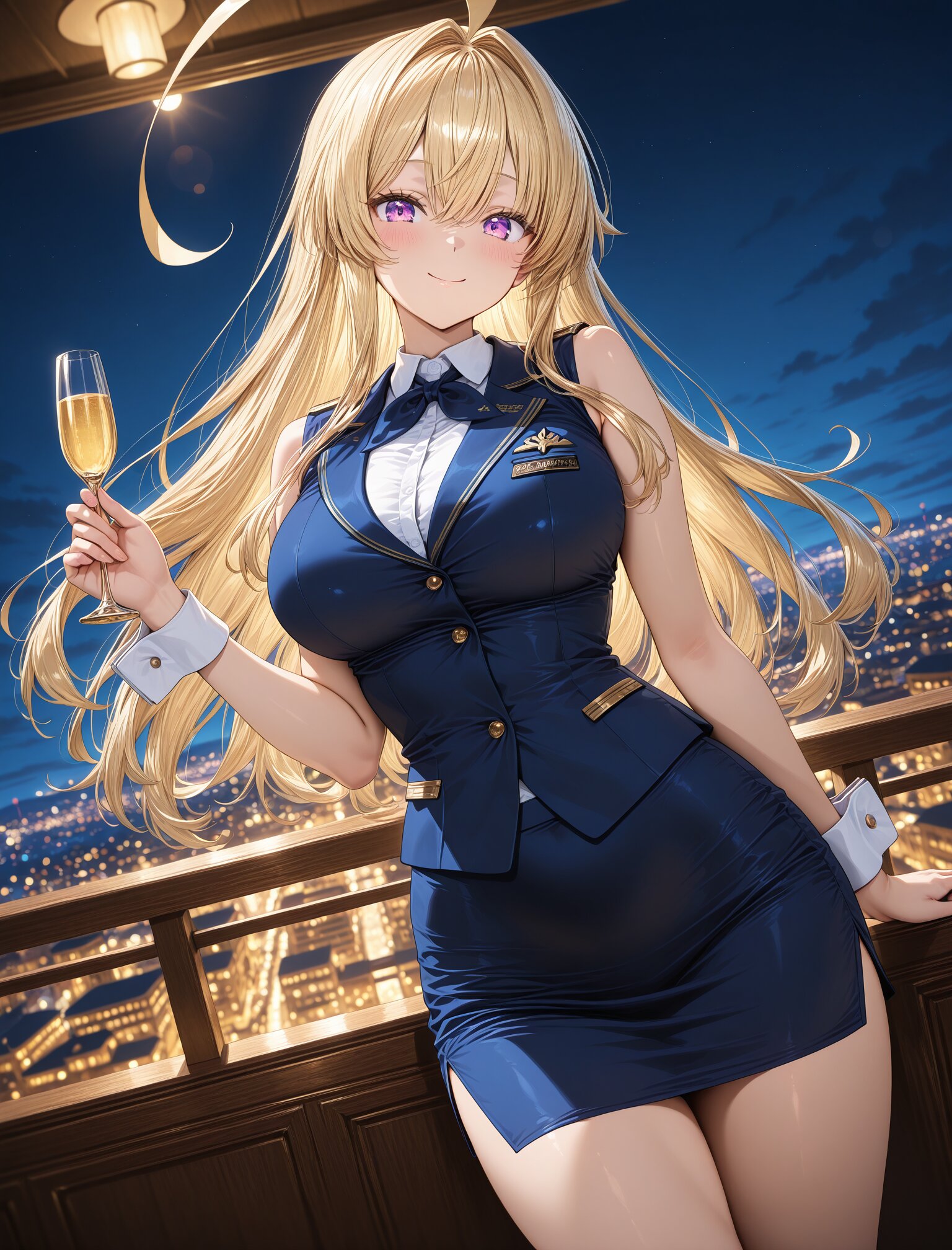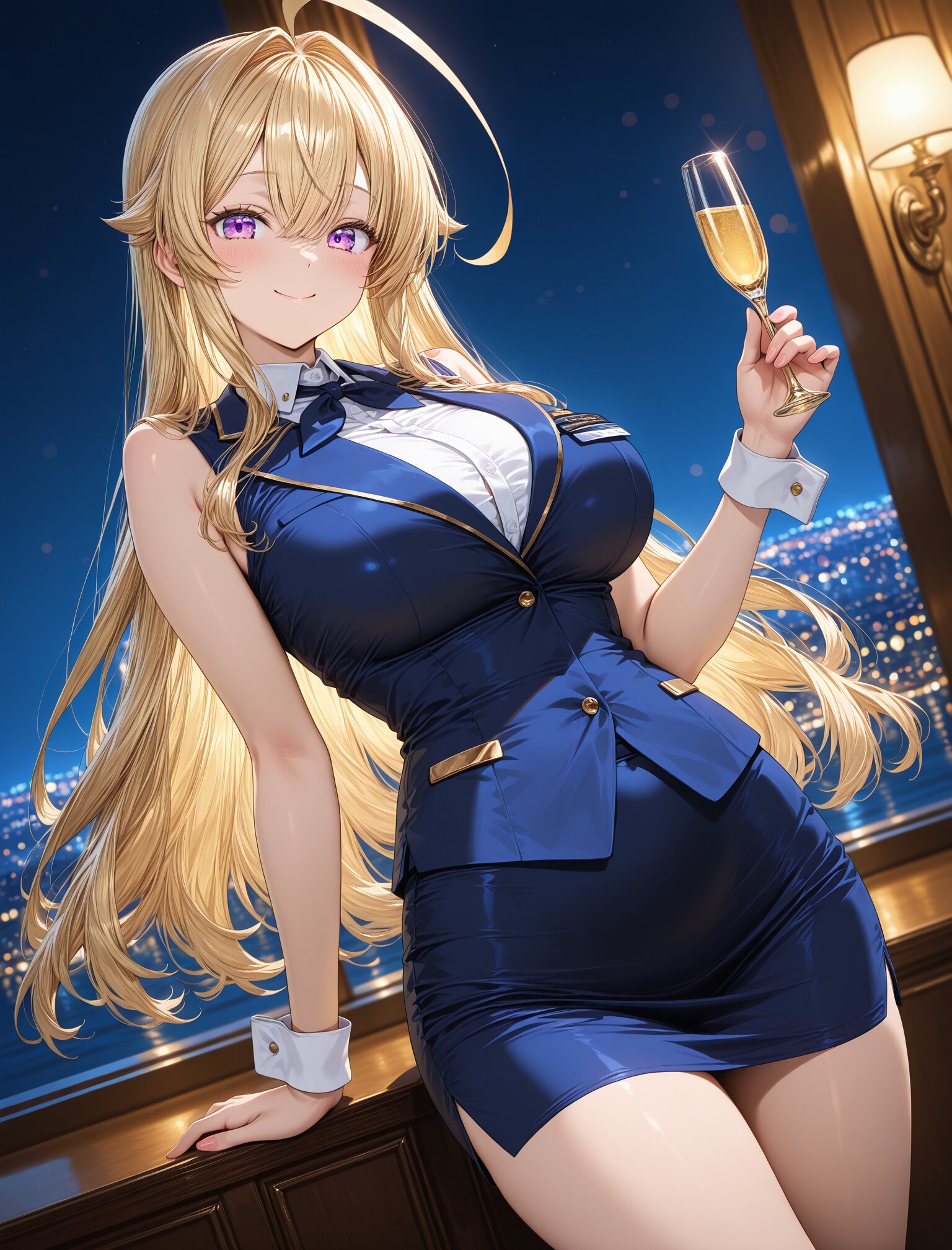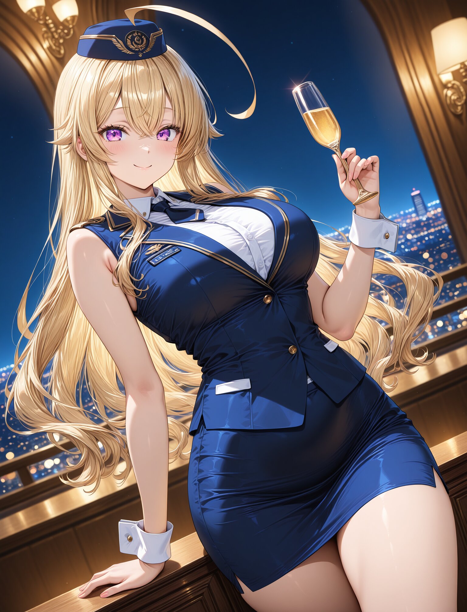 (stewardess uniform),(smile:1.3),(large breasts and hips),(huge ahoge),(smile:1.3),(long blond hair), dynamic angle,masterpiece,best quality,very aesthetic, luxury first class aircraft cabin, champagne service, bare arms, crisp white cuffs, elegant wrist line, glossy navy uniform, dramatic cabin lighting, warm ambient light, night city lights, intense bokeh, stronger rim light, golden reflections, crisp specular highlights, shallow depth of field, cinematic color grading, masterpiece , (glossy surfaces:1.3), (controlled specular highlights:1.3), (golden reflections:1.2), (soft rim light:1.2) <lora:StS-Illustrious-Detail-Slider-v1.0:2.> <lora:sdxl-hairdetailer_02:2>