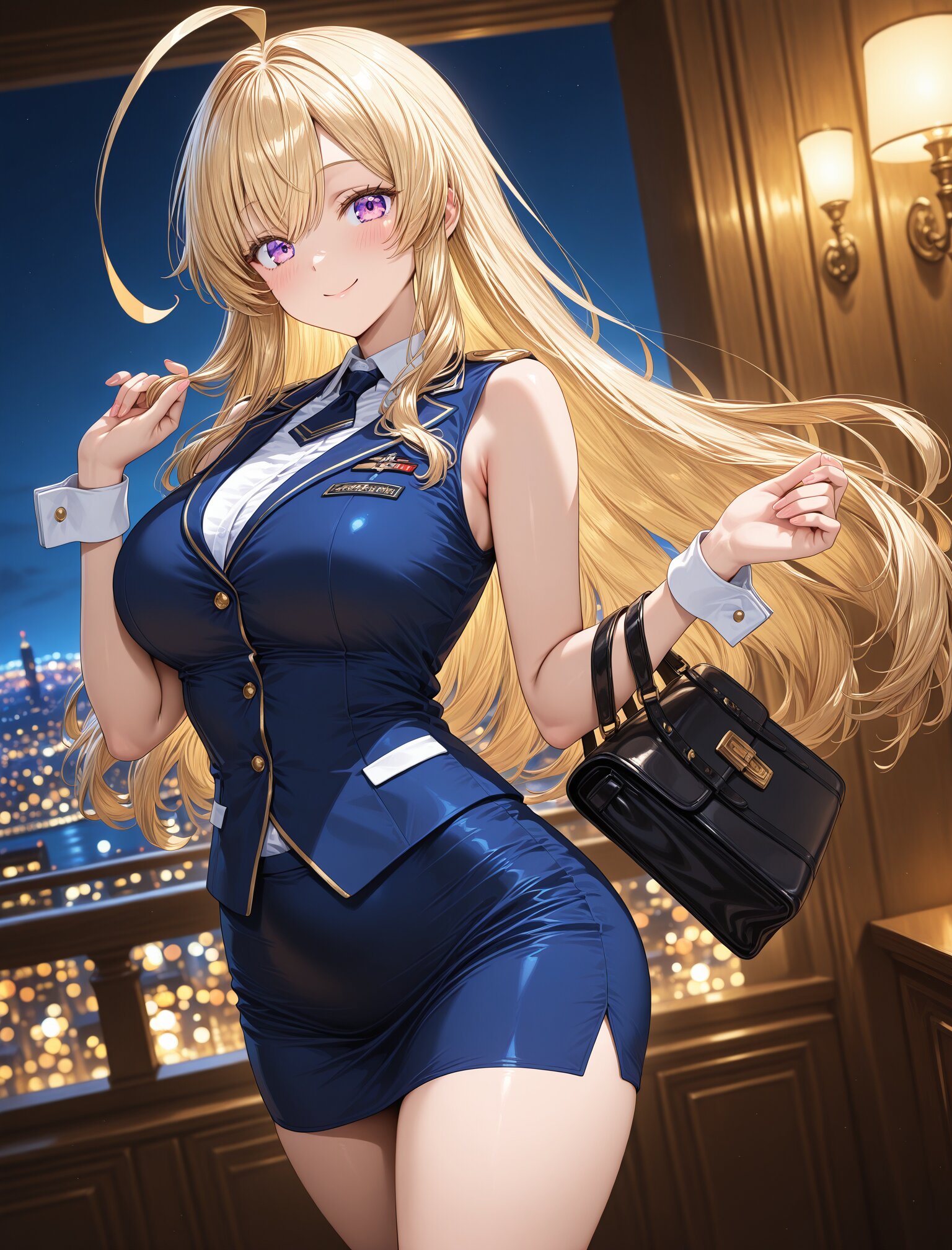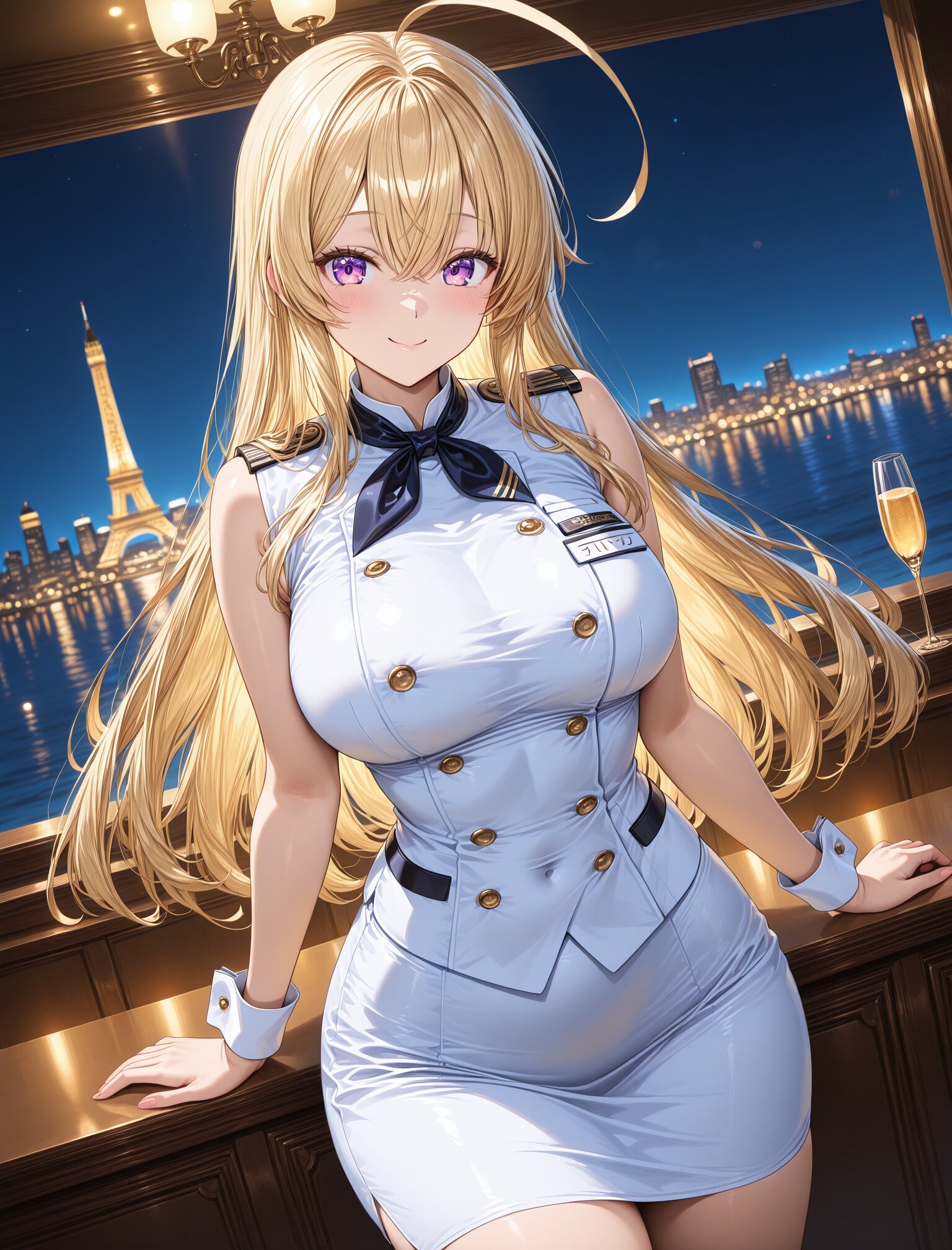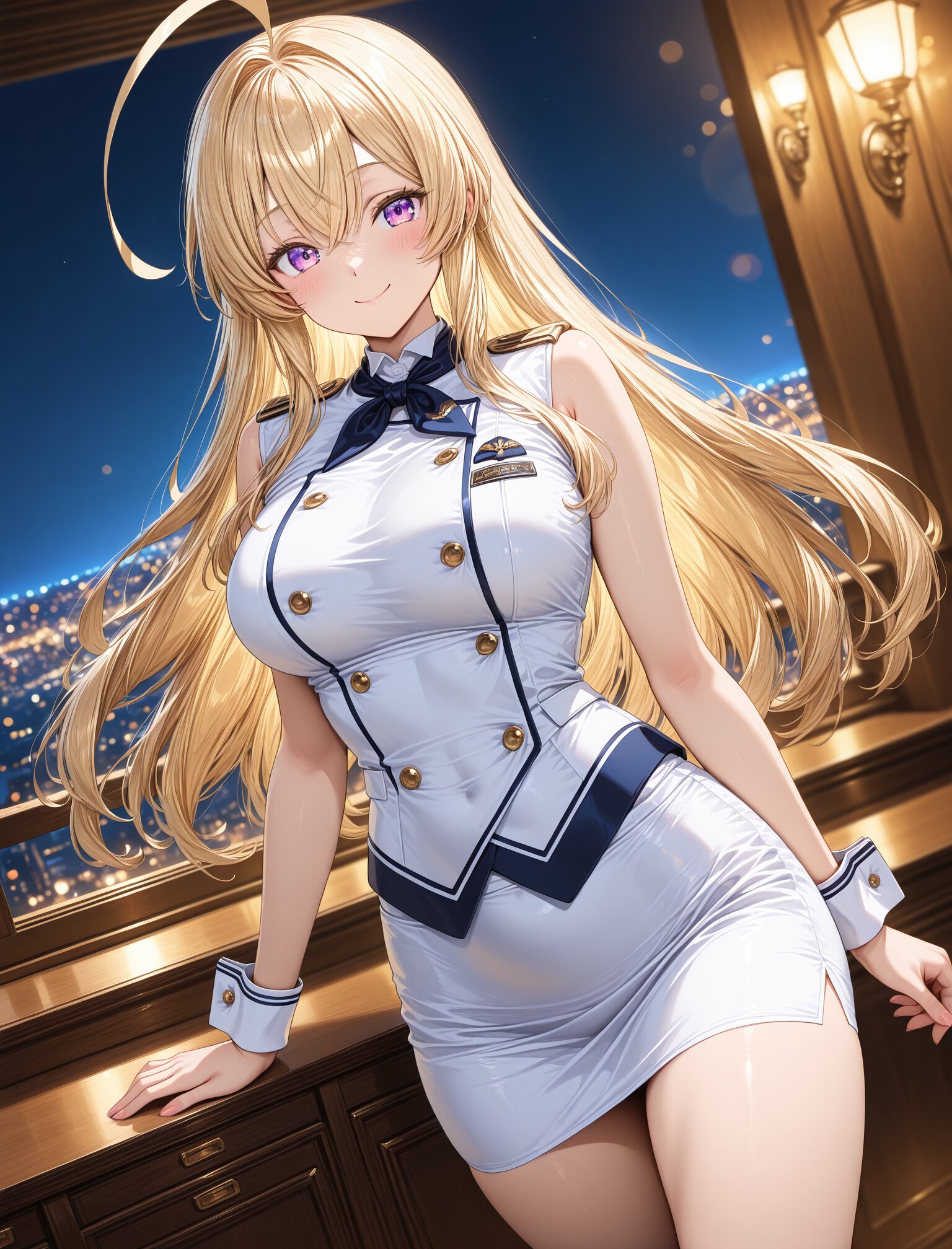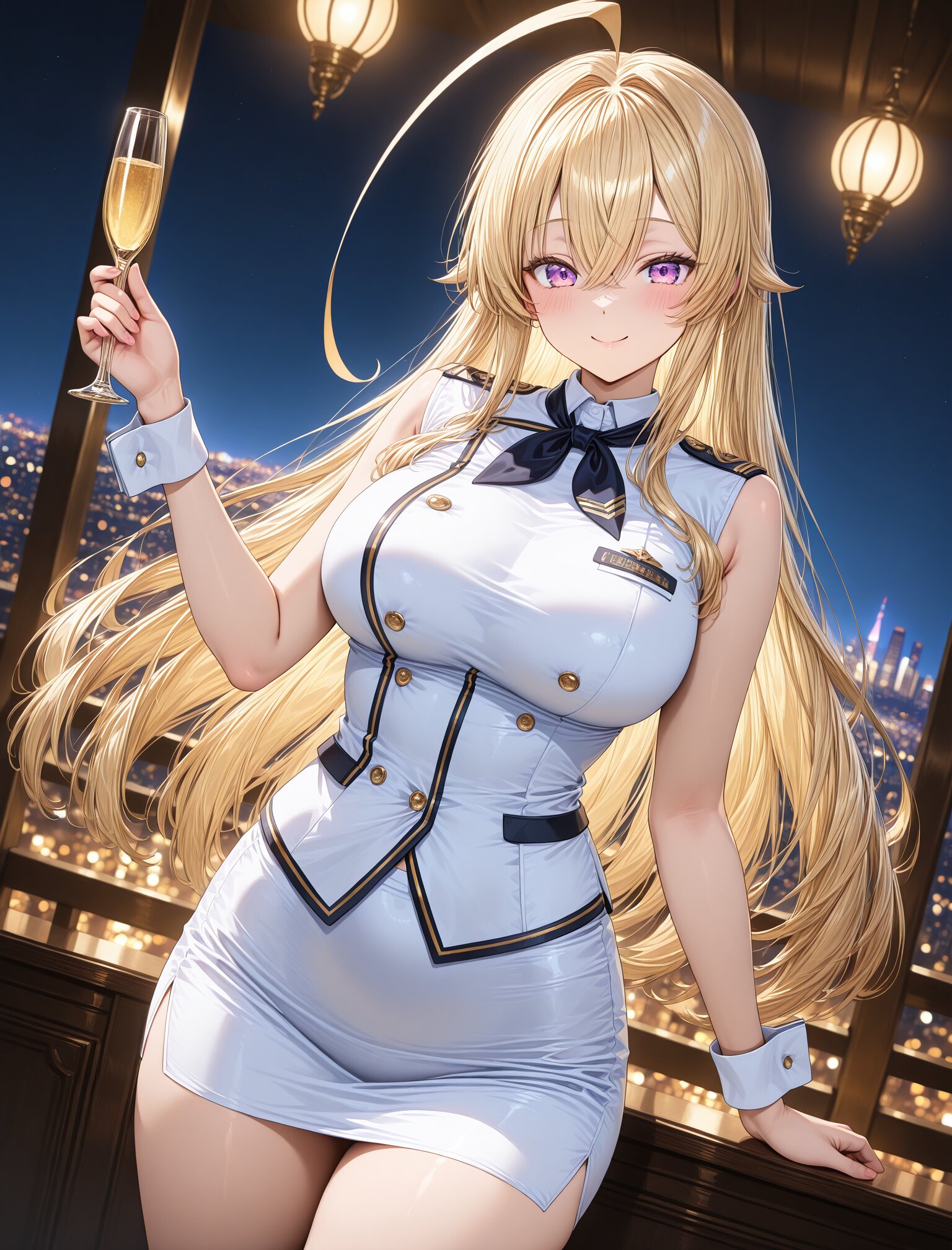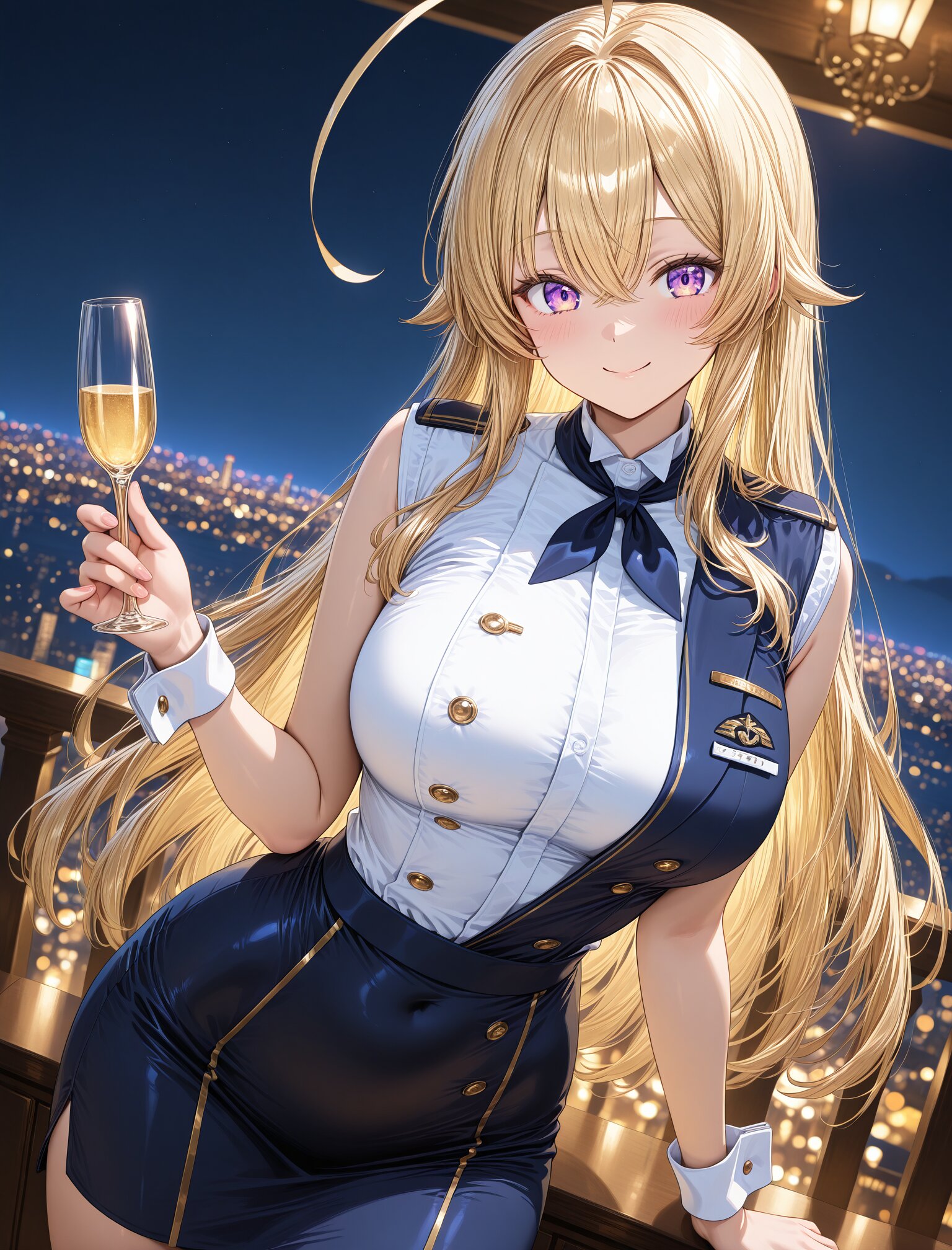 (stewardess uniform),(smile:1.3),(large breasts and hips),(huge ahoge),(smile:1.3),(long blond hair), dynamic angle,masterpiece,best quality,very aesthetic, luxury first class aircraft cabin, champagne service, bare arms, crisp white cuffs, elegant wrist line, glossy navy uniform, dramatic cabin lighting, warm ambient light, night city lights, intense bokeh, stronger rim light, golden reflections, crisp specular highlights, shallow depth of field, cinematic color grading, masterpiece , (glossy surfaces:1.3), (controlled specular highlights:1.3), (golden reflections:1.2), (soft rim light:1.2) <lora:StS-Illustrious-Detail-Slider-v1.0:2.> <lora:sdxl-hairdetailer_02:2>