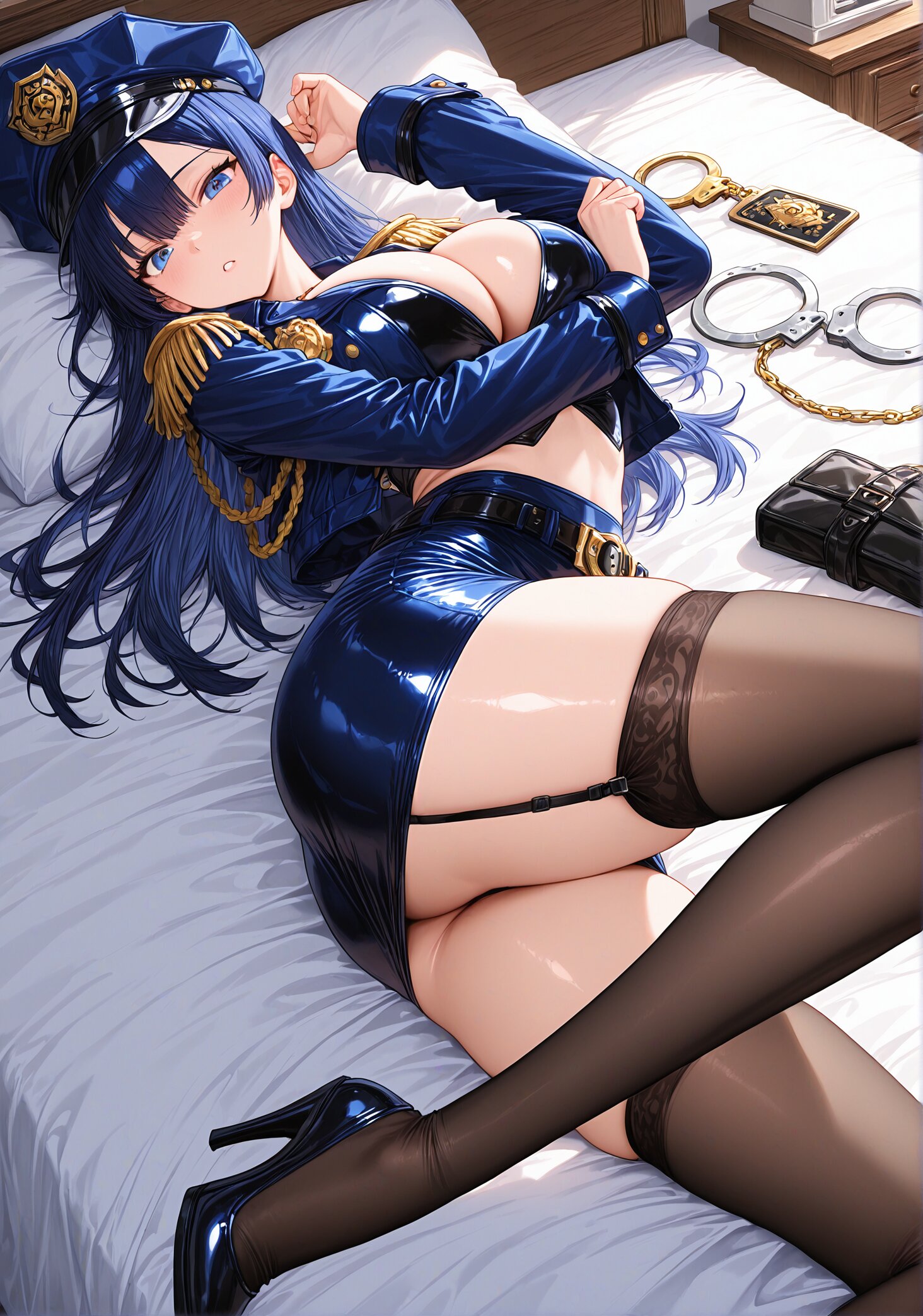 sexy mini skirt police cosplay,ultra short mini skirt,fitted police jacket, open front,deep cleavage,tight waist, body-hugging outfit,glossy black fabric, gold buttons,police badge,shoulder epaulettes,police cap, tilted,handcuffs on belt,leather utility belt,black garter belt,sheer black stockings, (healthy skin tone:1.4),(glossy skin:1.7), (smooth s:kin1.4),(long legs:1.6),(large breasts and hips), (dynamic sexy pose:1.8),(dynamic sexy angle:1.8), masterpiece, best quality, ultra-detailed, 8k resolution, very aesthetic, <lora:StS-Illustrious-Detail-Slider-v1.0:2.> <lora:sdxl-hairdetailer_02:2>