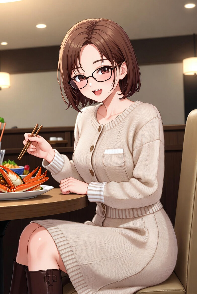 女性23歳のイラスト。 brown hair, brown eyes, forehead, glasses, short hair、前髪は左右に流しておでこが広く見えている、軽いメイク、遊び心のある可愛い表情で微笑む、フルボディ、ライトベージュのニットカーディガンワンピースを着用、長袖、ボタンダウン前端、小さなボタン、胸ポケット、白いトリムが袖口・襟・ウエストにアクセント、テクスチャードニット生地に微かなラメ、ボディフィットからフレアAラインのミディ丈スカート(ふくらはぎ中間まで)。ダークブラウンのレザー膝丈ブーツ(ヒール付き)を合わせる。 レストランのテーブルに座っている。テーブルの上にはカニ料理が並んでいる。箸をもって食べようとしている。うれしそうな表情。