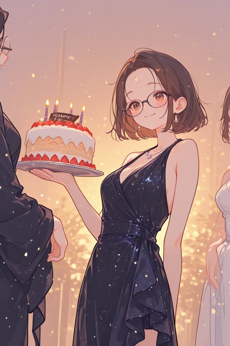 (best quality),(masterpiece),(ultra detailed), ,(1 lady, some female), short hair, brown hair, glasses, (open forehead), evening gown, (birthday cake, smile)
