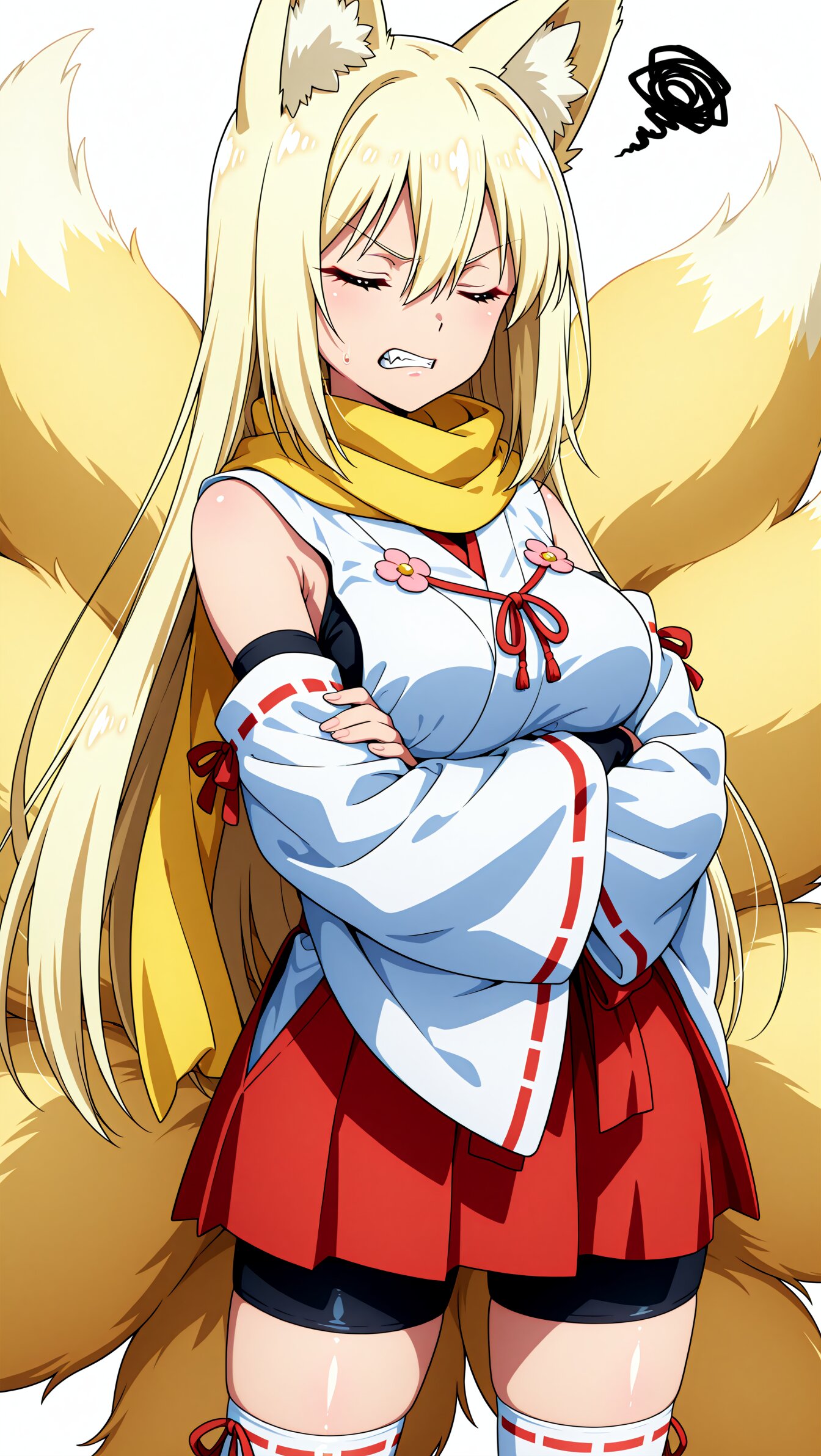 <lora:MeMax6-noob-vpred:1>,memaxl6_a,memaxl6_b,memaxl6_c,memaxl6_d,memaxl6_e, (10's anime style:1.1) Full HD,32K, 1girl, (teenage):1.4, medium breasts, (skinny), upper body, standing, solo, squiggle, annoyed, v-shaped eyebrows, clenched teeth, v-shaped eyebrows, (crossed arms:1.2, arms under the breasts), fox ears, fox tail, nine tails, mysterious, fangs, shiny hair, beautiful hair, shiny hair, ((long hair, straight hair), ((blonde hair)), (hair between eyes), closed eyes, (tsurime:1.3), (japanese clothes, red-white miko:1.5, clothing cutout, armpit, red-hakama short skirt, bike shorts, white thighhighs, ), black undershirt, long yellow scarf, (simple background, white background), masterpiece, best quality, super fine illustration, very aesthetic, newest, hyper detailed, intricate, beautiful, aesthetic, highly decorative, HDR, yume kawaii, ,anime screencap,anime,no gradients, 2D flat design, bold outlines,