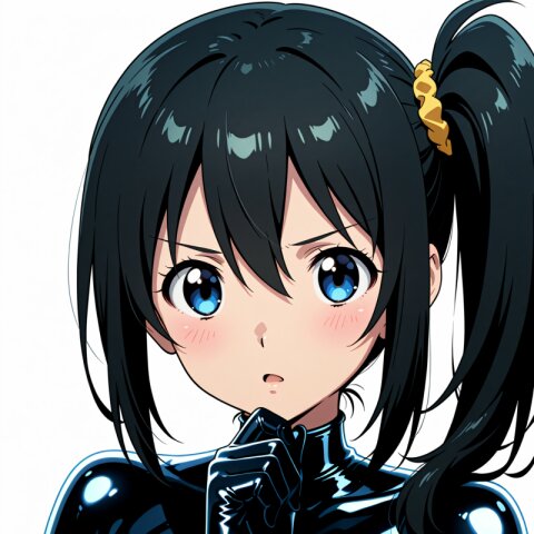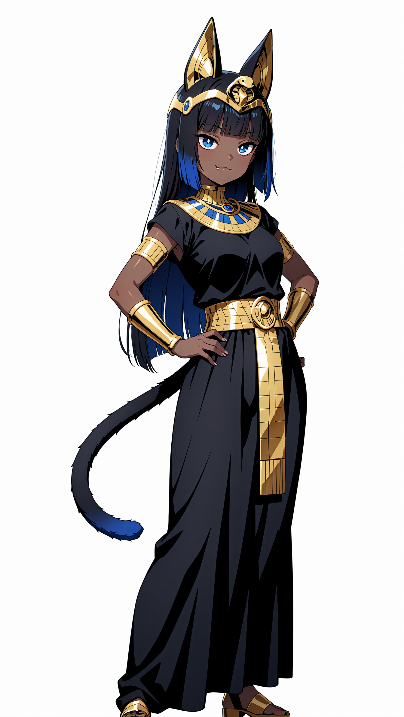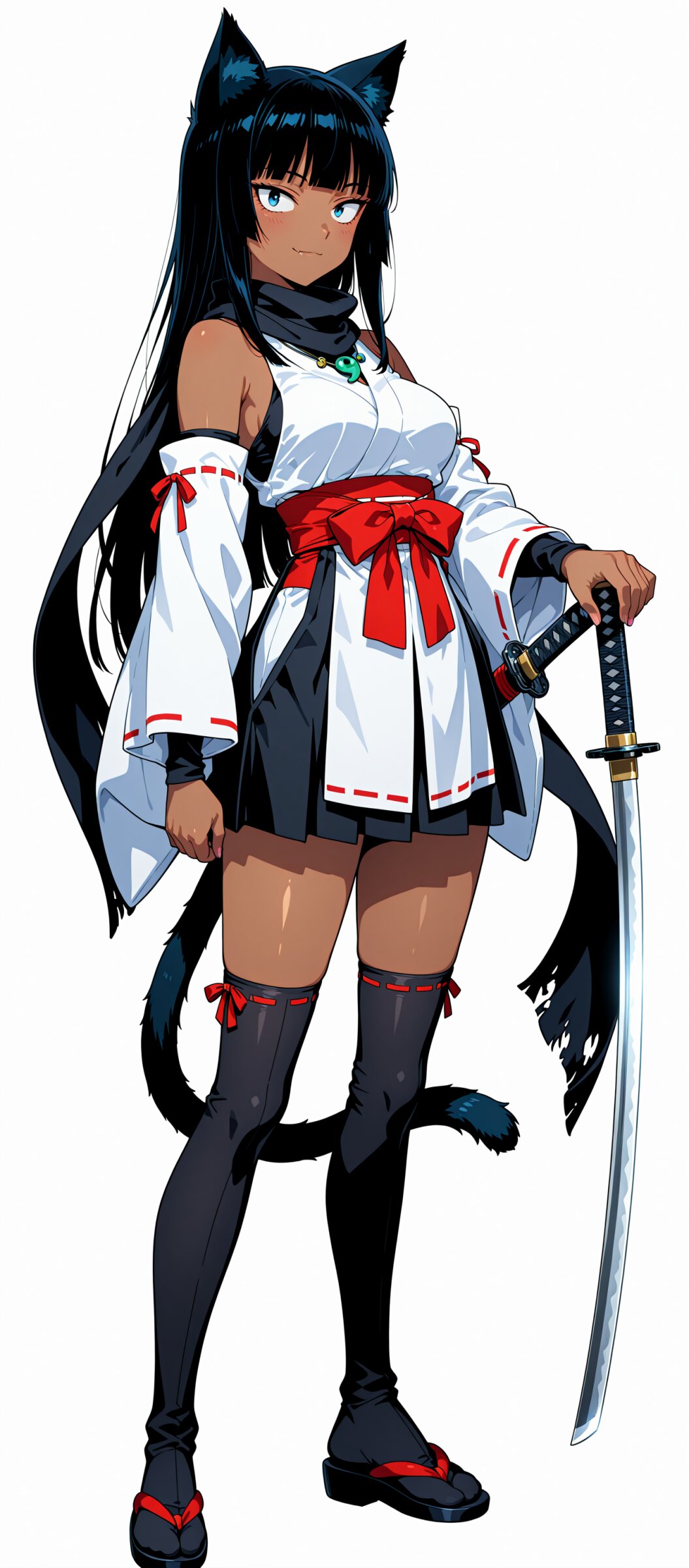 <lora:MeMax6-noob-vpred:1>,memaxl6_a,memaxl6_b,memaxl6_c,memaxl6_d,memaxl6_e, 10's anime style, Full HD, 32K, 1girl, full body, (from front), standing, (solo), (teenage:1.4), medium breasts, cat ears, cat tail, mysterious, blush, fangs, (very dark skin:1.1), beautiful hair, shiny hair, (long hair, black hair, blunt bangs, straight hair, ), blue eyes, white pupils, (tsurime:1.3, sanpaku:1.8), (japanese clothes, black hakama short skirt:2.0, bike short, miko, bare shoulders, clothing cutout:1.6), (black undershirt), black thighhighs, black tabi, (long black scarf:1.2), magatama necklace:1.2, looking at viewer, smile, closed mouth, holding katana, (simple background), (white background:2.5), masterpiece, best quality, super fine illustration, very aesthetic, newest, hyper detailed, intricate, beautiful, aesthetic, highly decorative, HDR, yume kawaii, ,anime screencap, anime, no gradients, 2D flat design, bold outlines,