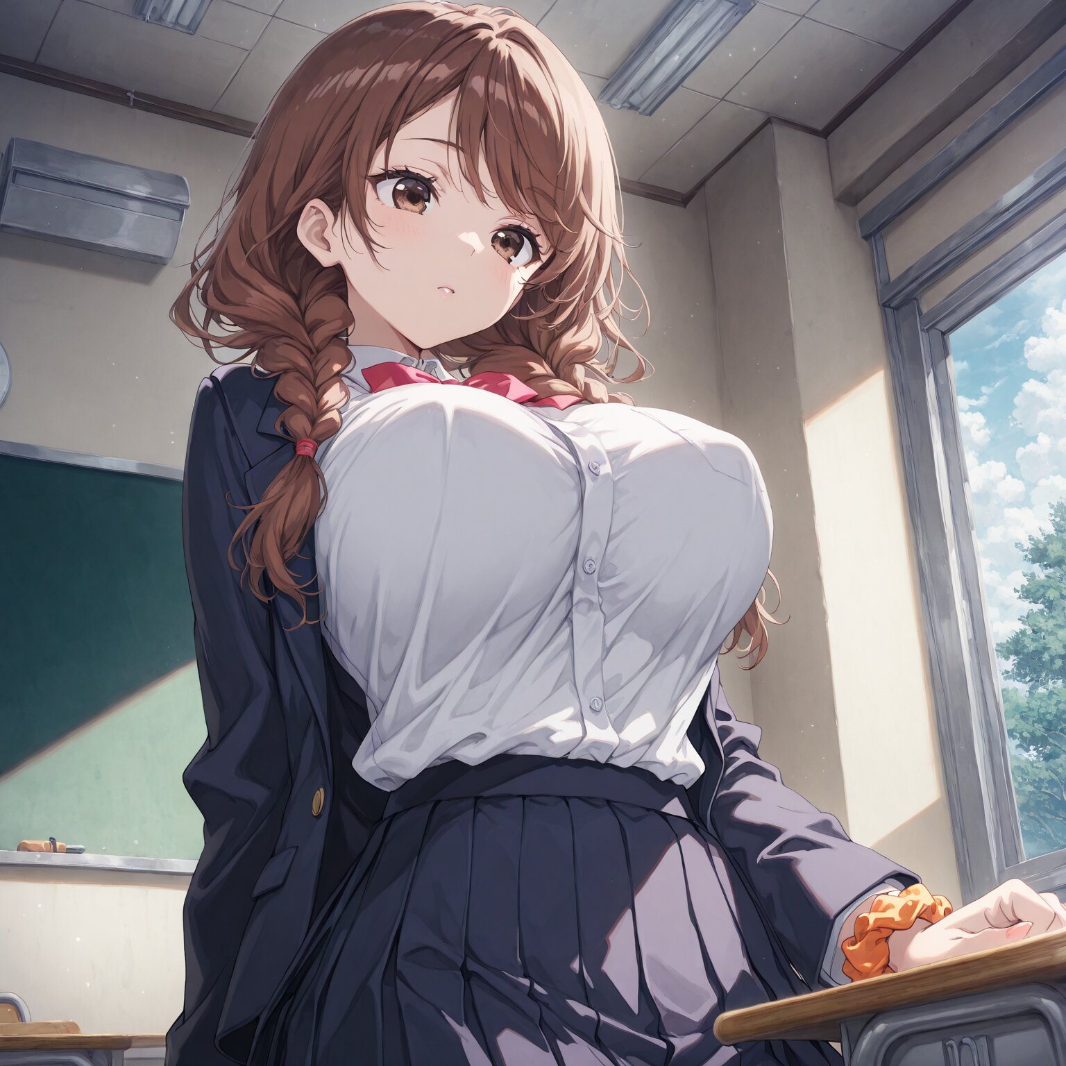 1girl, Brown hair, chestnut hair, curly hair, swept bangs, long hair, (twin braids), droopy eyes, timid Scrunchie around the wrist Huge breasts, perky breasts School uniform, blouse, dress shirt, blazer, pleated skirt, School classroom, BREAK, (newest, anime, animation, anime screen capture, anime style:1.3) BREAK, (masterpiece, , vibrant, very aesthetic, highly detailed, best quality, 16k:1.3)
