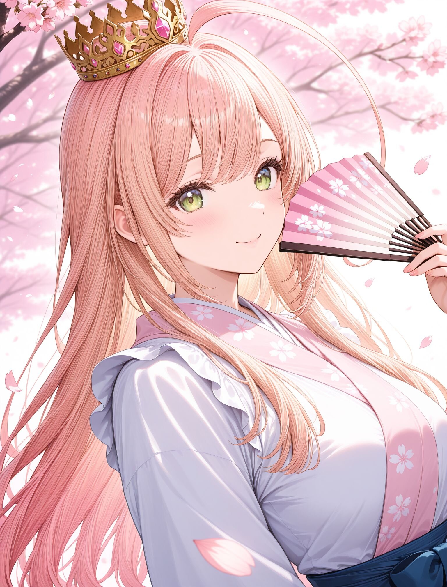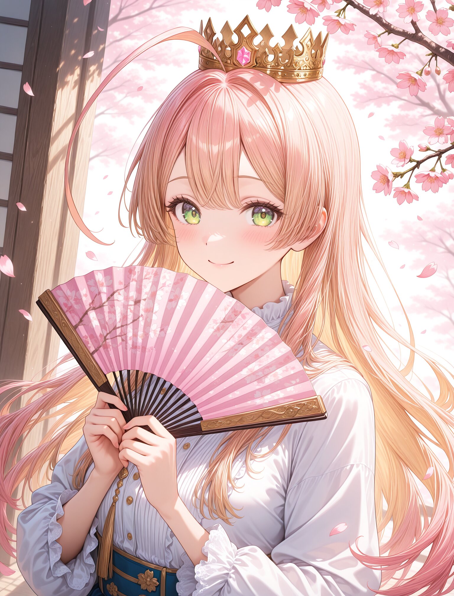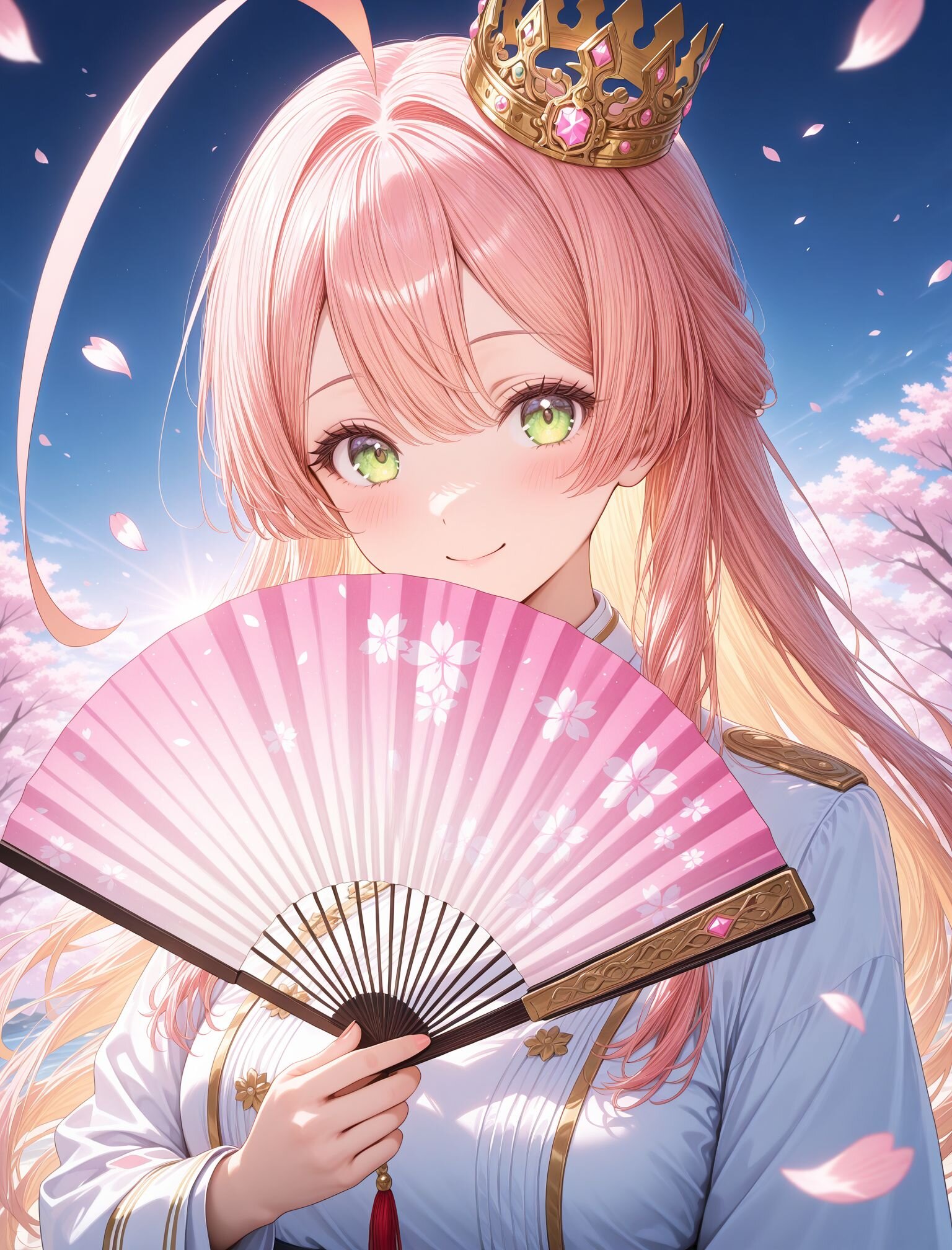 (long blond hair:1.4),(huge ahoge:1.5),(calm smile),(upper body:1.4), (golden crown:1.6),holding elegant folding fan, (pink sakura storm:1.8),(strong pink glow:1.6), pink sakura petals, pink spring atmosphere, elegant japanese spring symbolism, sakura petals drifting in sunlight, soft spring backlight, dynamic angle, masterpiece,best quality,very aesthetic, ultra detailed,cinematic lighting, petals glowing in backlight <lora:StS-Illustrious-Detail-Slider-v1.0:2> <lora:sdxl-hairdetailer_02:2>