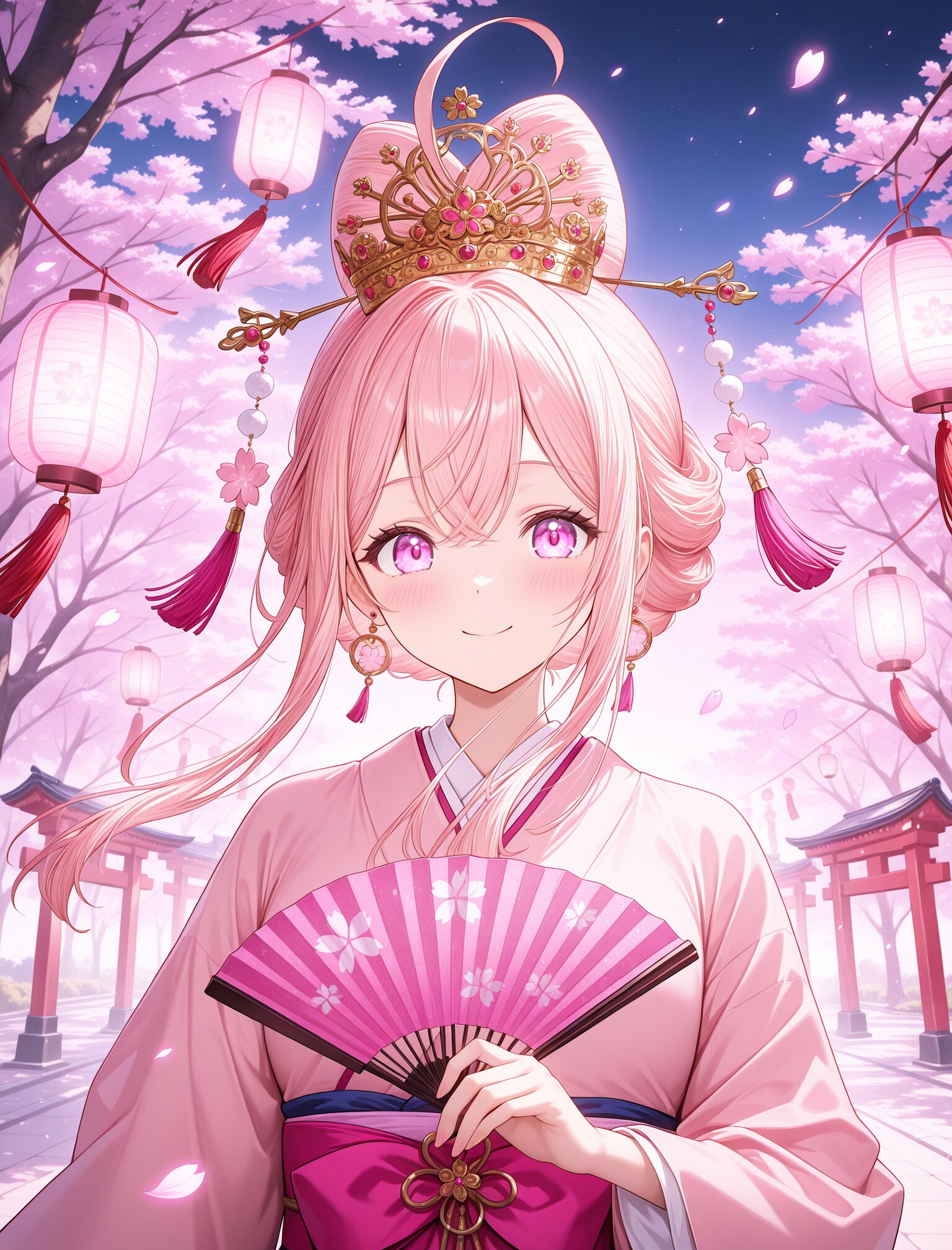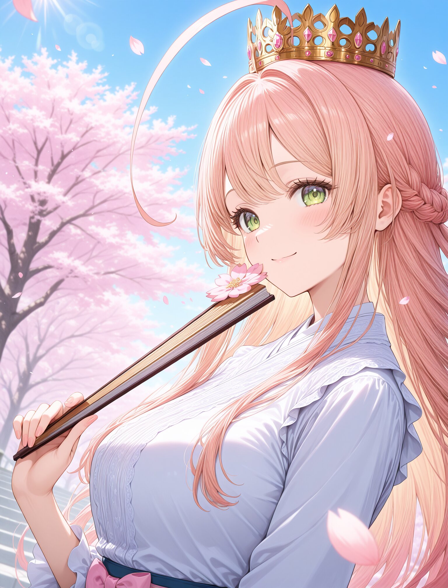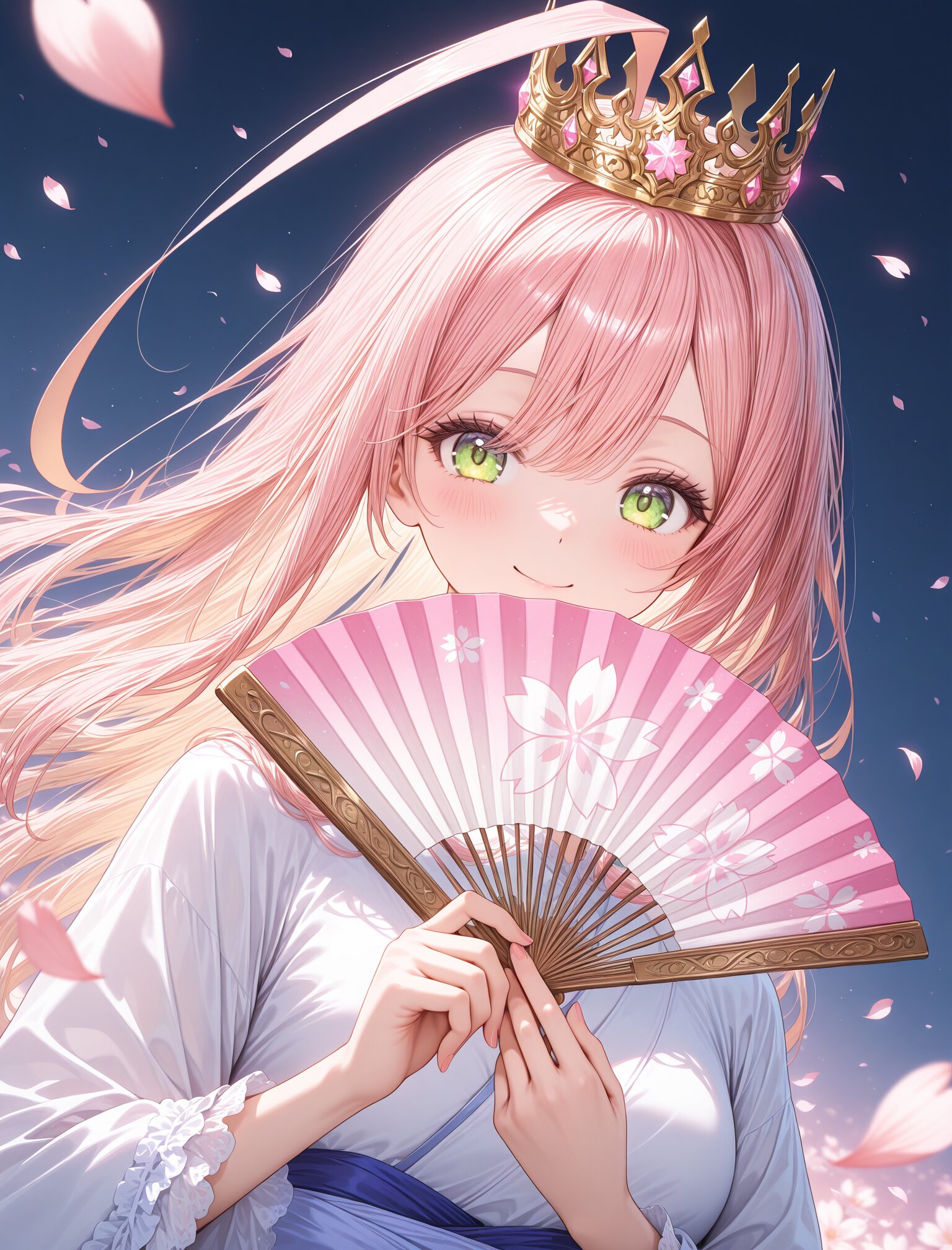 (long blond hair:1.4),(huge ahoge:1.5),(calm smile),(upper body:1.4), (golden crown:1.6),holding elegant folding fan, (pink sakura storm:1.8),(strong pink glow:1.6), pink sakura petals, pink spring atmosphere, elegant japanese spring symbolism, sakura petals drifting in sunlight, soft spring backlight, dynamic angle, masterpiece,best quality,very aesthetic, ultra detailed,cinematic lighting, petals glowing in backlight <lora:StS-Illustrious-Detail-Slider-v1.0:2> <lora:sdxl-hairdetailer_02:2>