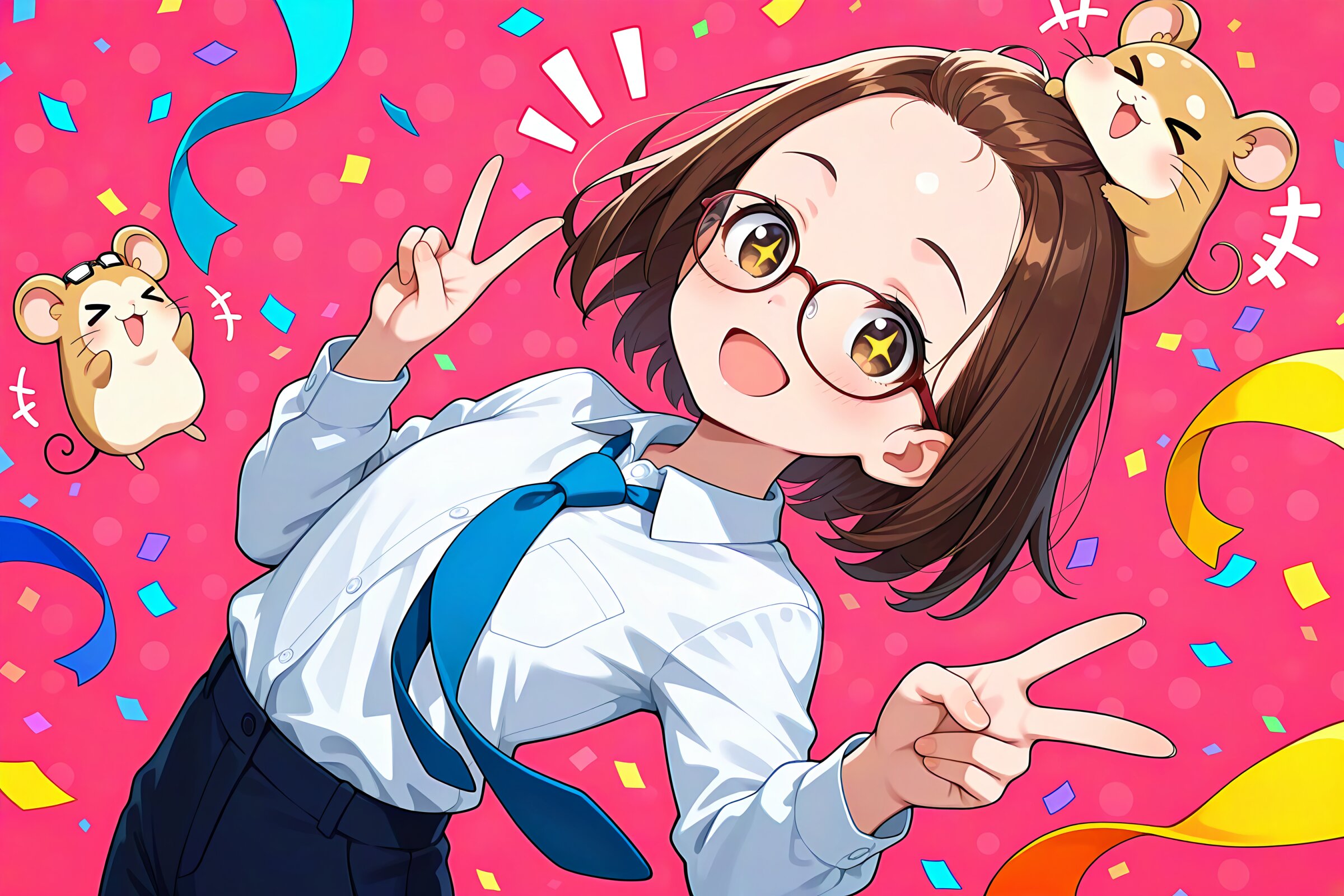 1 little girl, solo, diagonal angle, upper body, masterpiece, best quality, amazing quality, very aesthetic, brown hair, brown eyes, forehead, glasses, short hair, +_+, open mouth, smile, cheerful, +++, notice lines, white shirt, business suits, pants, blue tie, closed neck, v, dynamic pose, floating, hamsters on her head, > <, colorful confetti, pink patterned background,