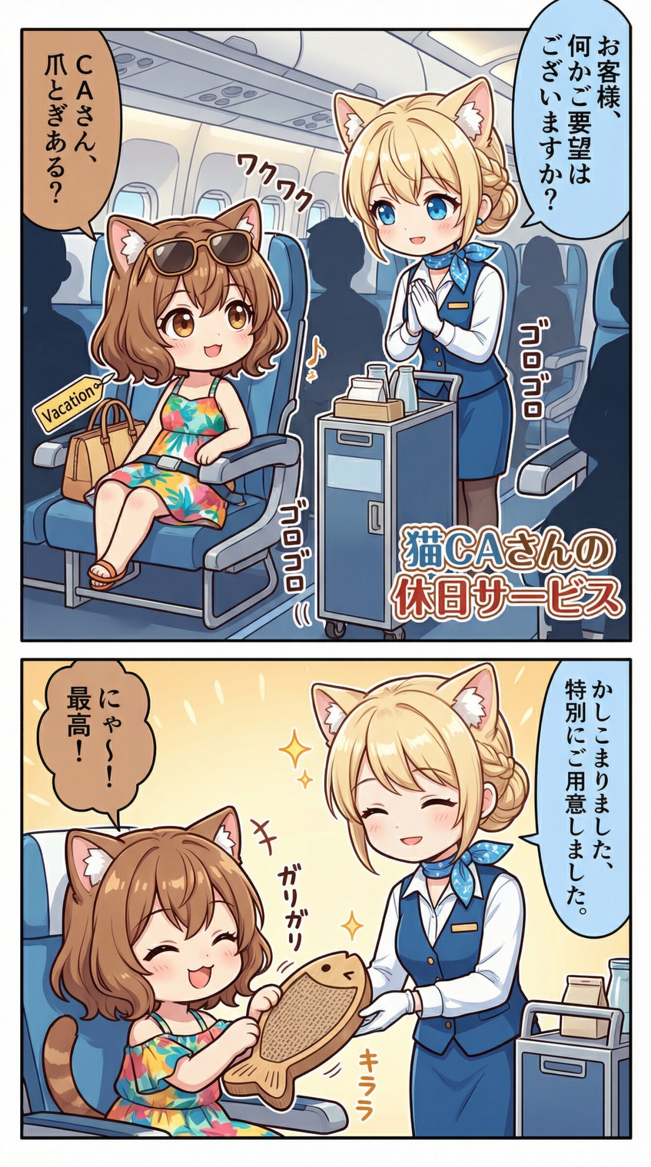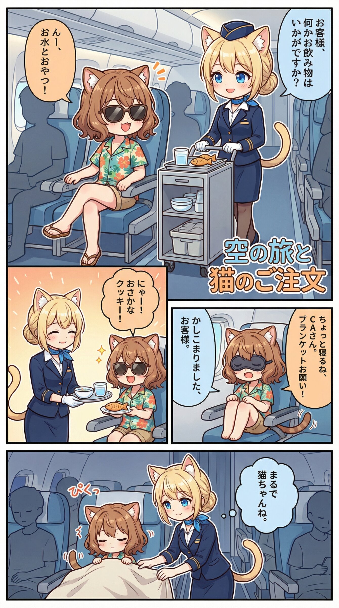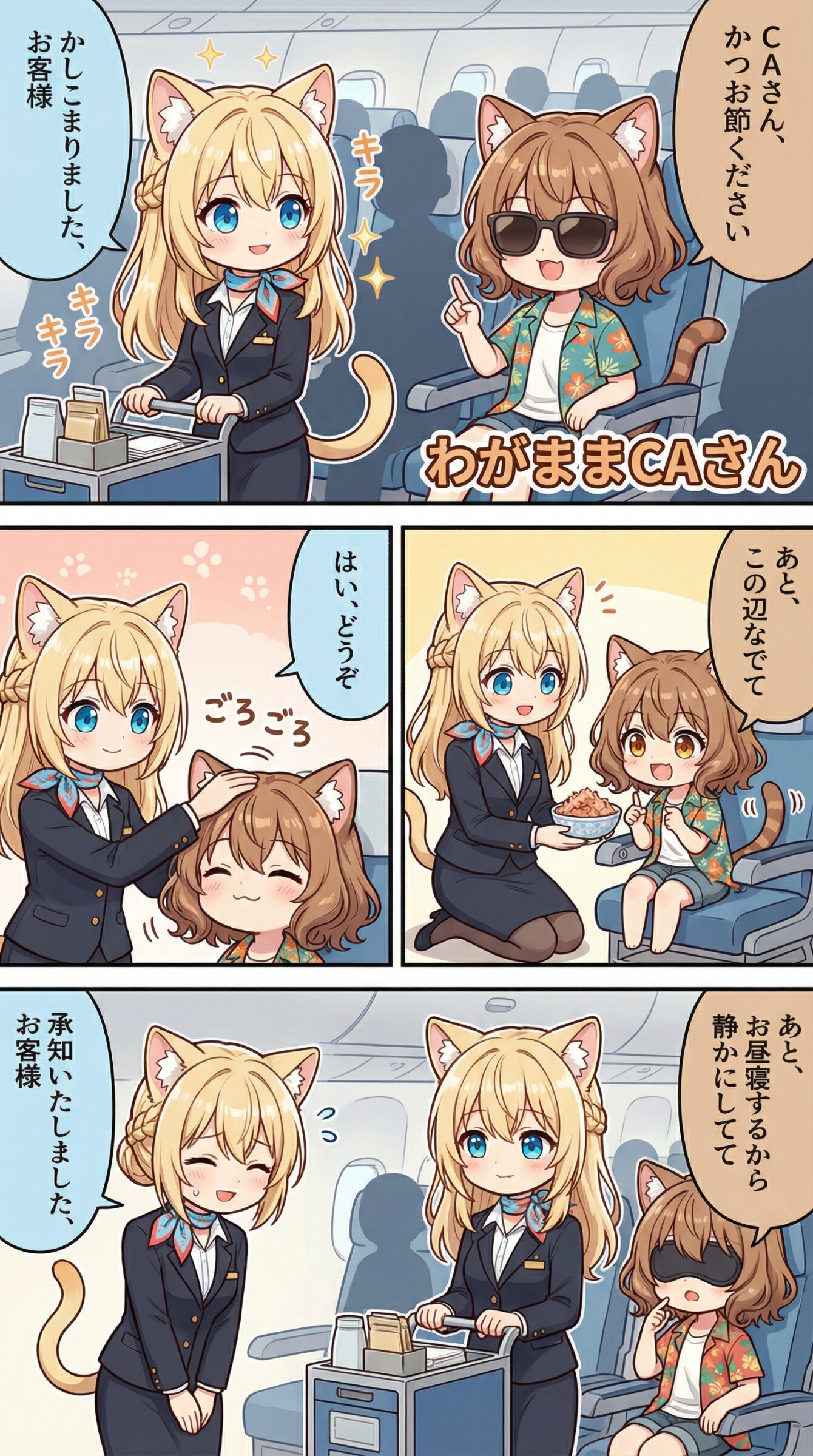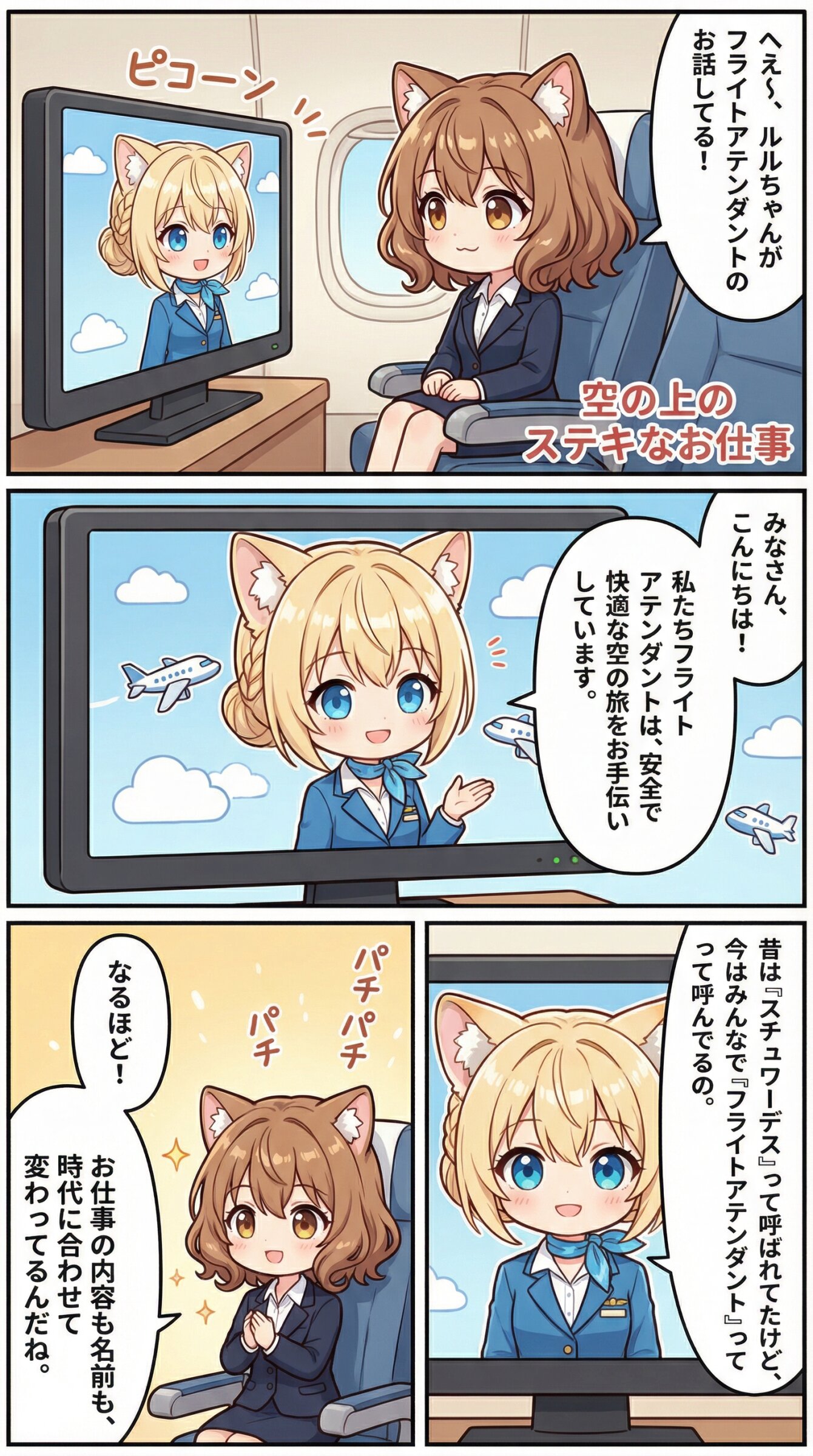 ※1~3枚目 Use the uploaded image as the absolute visual reference for the character's face. Do not deviate from the original design. Based on the character designs in the uploaded image, depict two characters: Mimi and Ruru. Maintain the exact same character design for both. Character details: Mimi: She has chestnut brown hair, wavy bob hair, hair between eyes, loose inward curls, brown eyes, and cat ears, natural cat tail. Her facial features must remain consistent with the reference. Ruru: She has blonde hair, braid, hair between eyes, neat low bun, hair smoothly gathered under fluffy cat ears, balanced and symmetrical hairstyle, elegant airline crew style, soft side bangs, blue eyes, and cat ears, natural cat tail. Her facial features must remain consistent with the reference. Match the art style, and line work of the uploaded image perfectly. カートを押して登場する、スチュワーデスのルル(ミミからCAさんと呼ばれる)が主役の、ユニークなカラー漫画を作って。 乗客のミミ(バカンスを満喫するつもり満々の服装とサングラス)が接客されている。 ミミはルルからお客様と呼ばれる。 ミミがしてくるいろいろな注文(猫っぽい内容)を華麗に対処する。 他の乗客はシルエットのみ。 それぞれの吹き出しにキャラに合わせて薄く色をつけて。 セリフやオノマトペはすべて日本語。 右から左へ読むことを前提としたセリフ、それに合わせたキャラ配置、コマ配置。 内容に合ったタイトルをつける。 タイトルは内容に沿ったデザインの飾り文字とする。 タイトルは1コマ目内の右下か左下に配置する。 アスペクト比9:16。 ※4枚目 スチュワーデスのルルがCAについて簡単に解説する、ユニークなカラー漫画を作って。 乗客のミミ(ビジネススーツ)がモニターで解説を視聴しながら、相槌を打っている。 小学生でもわかりやすい説明。 スチュワーデスと言わなくなったことにも触れる。 セリフやオノマトペはすべて日本語。 右から左へ読むことを前提としたセリフ、それに合わせたキャラ配置、コマ配置。 内容に合ったタイトルをつける。 タイトルは内容に沿ったデザインの飾り文字とする。 タイトルは1コマ目内の右下か左下に配置する。