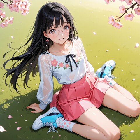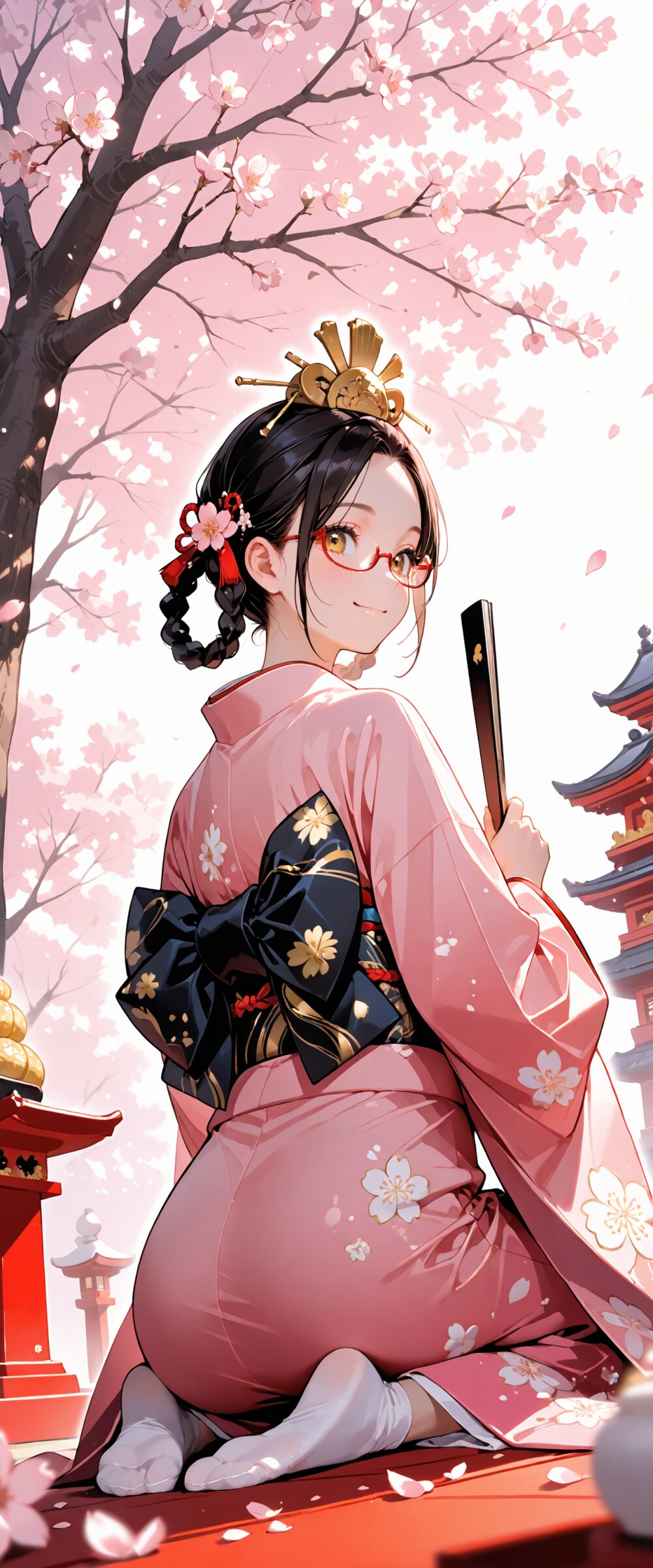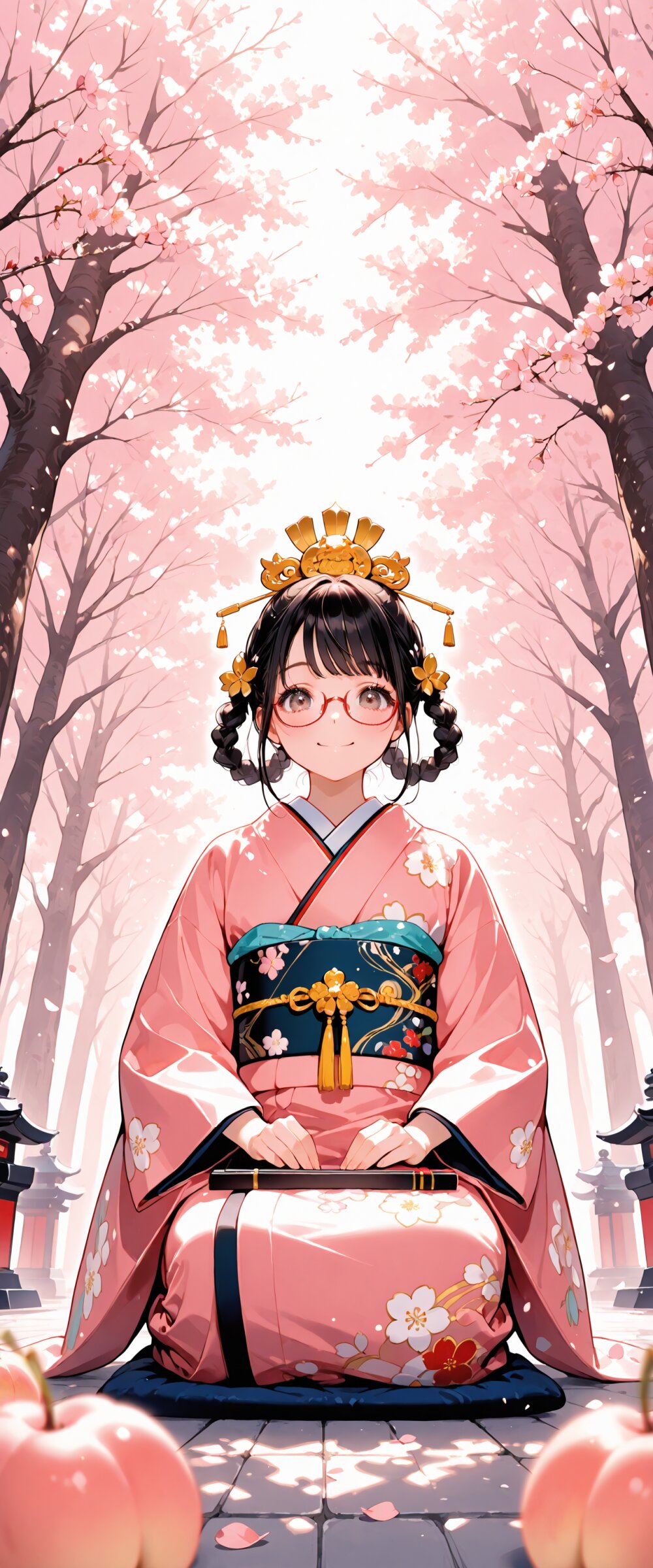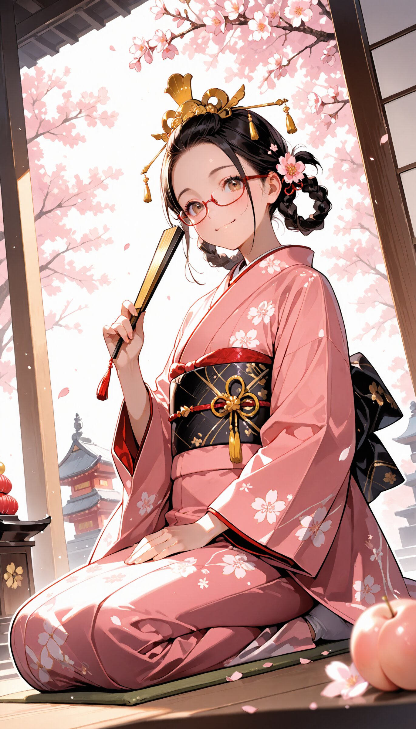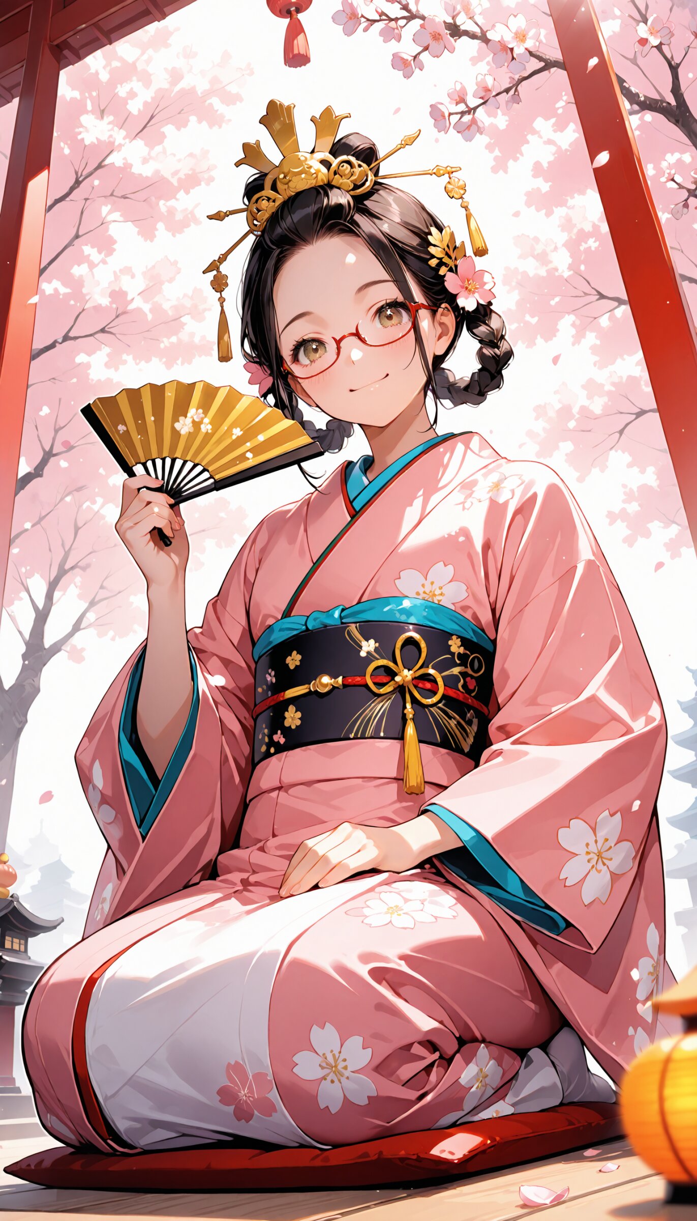 (rating: sensitive:1.2), score_9, score_8_up, score_7_up, score_6_up, source_anime, (delicate illustration), (pastel color style illustration, flat colors, pale colors), (perspective, super dynamic angle from below, looking at viewer), diagonal view, (cherry blossoms in full bloom, petals falling gently, particles of light, divine light). A fashionable girl, (red under-rim eyewear), (braided hair rings), Hinamatsuri, Ohina-sama costume, traditional japanese clothes, ornate kimono, juunihitoe, layered Kimono, dressed in beautifully detailed traditional hina doll outfits, which are festive and colorful Japanese kimono with gold accents, and a pink kimono with intricate patterns, golden hair ornament, seiza, holding a Japanese oogi, opened, ritual fan, crown, peach blossoms, outdoor, The atmosphere is joyful and celebratory, with soft, warm lighting highlighting the intricate details of their costumes and the surrounding decorations. (sophisticated Hinamatsuri fashion illustration, kimono elegant, ultra-intricate detailed), flat design, (white outline), bold colors, patterned fabric, beautiful composition, in the style of cute anime girl. BREAK happy, big smile, closed mouth, detailed face, insanely beautiful and detailed Japanese clothes, extremely shiny hair, beautiful small face, long eyelashes, double eyelids, kawaii, cute, slender, perfect anatomy, (dynamic angle, dynamic pose), BREAK ((DOF), blurry foreground), sharp focus on the girl, emphasizing depth. realistic background. BREAK perfect AI rendering, three-quarter view. BREAK (masterpiece, aesthetic quality, 8K, ultra-detailed), spring color palette, (perfect design, realistic complex), absurdres, highres, hyperrealistic, photorealistic, natural lighting,