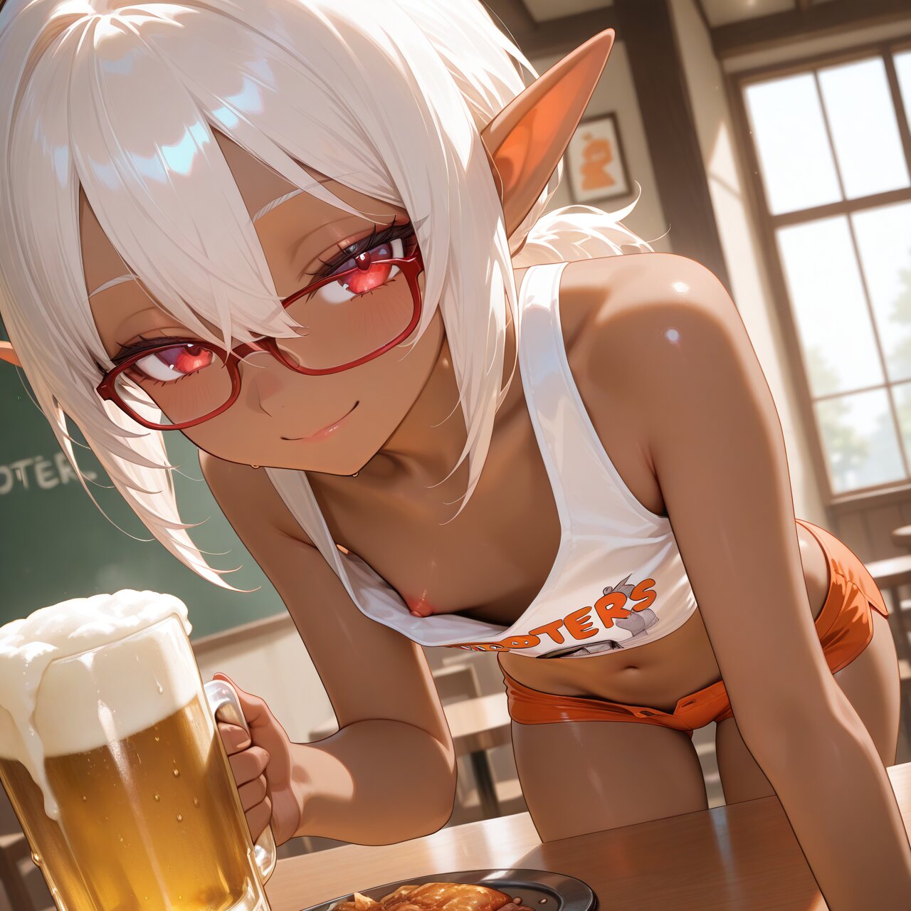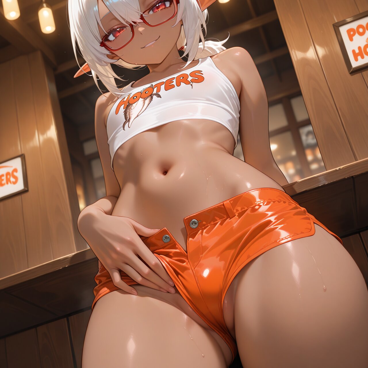 1girl, nsfw, hooters, indoors, thigh focus, (beautiful eyes, detailed eyes), three quarter view, looking at viewer, solo, cute, dutch angle, (dark skin, red-framed eyewear:1.2), white hair, low ponytail, medium hair, hair between eyes, flat chest, red eyes, elf, white tank top, orange micro shorts, lowleg, midriff, navel, unbuttoned, no panties, sweat, standing, beer, glass, seductive smile, masterpiece, best quality, amazing quality,