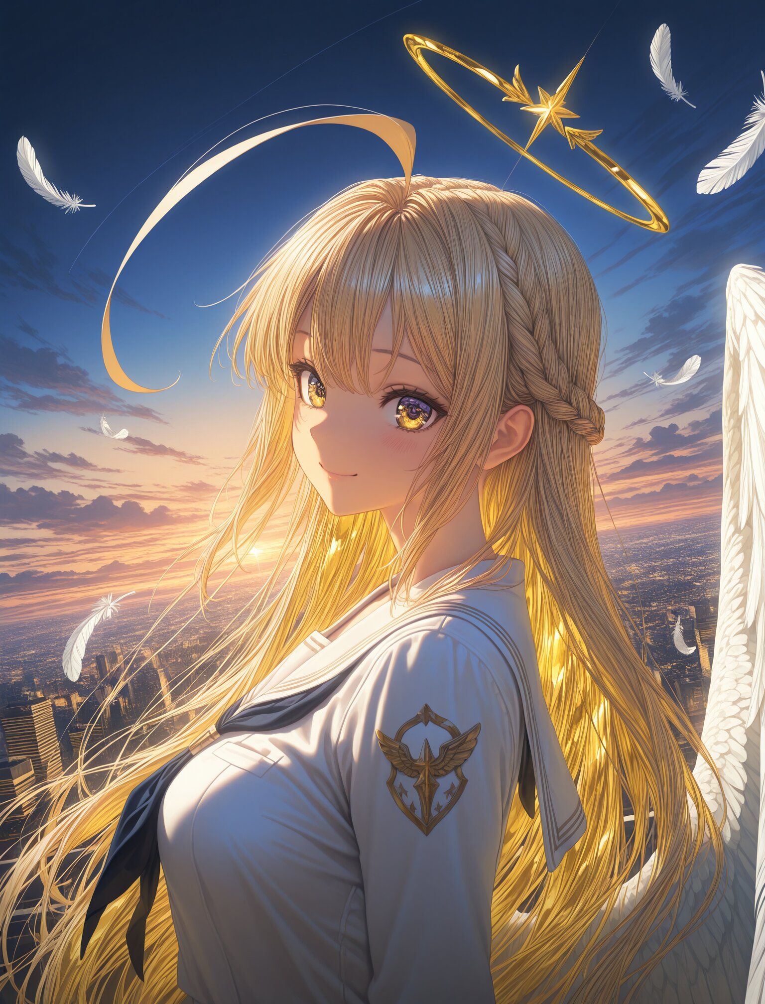 (upper body:1.4),(calm smile),(white serafuku),from side:0.5, archangel girl,long blonde hair,crown braid,huge ahoge, large white angel huge wings,white dress, floating above city,aerial city lights, sunset sky,soft rim light,angel feathers color grading, masterpiece, (glossy surfaces:1.3), (controlled specular highlights:1.3), (golden reflections:1.2), (soft rim light:1.2) dynamic angle,masterpiece,best quality,very aesthetic, <lora:StS-Illustrious-Detail-Slider-v1.0:2.> <lora:sdxl-hairdetailer_02:2>