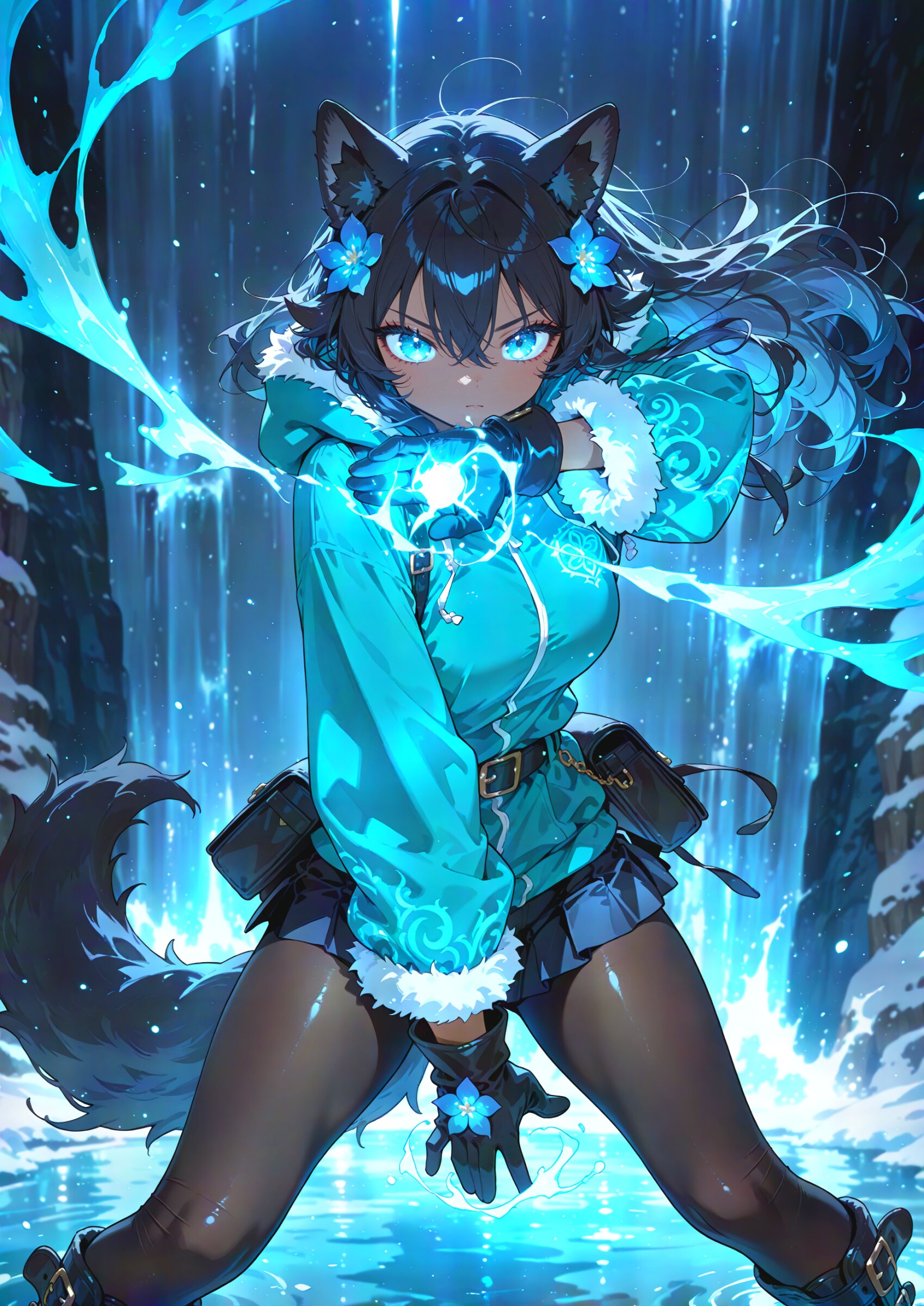 oblique angle, focus crotch, upper body, feet out of frame from behind 1girl, black wolf ears, dark skin, young beautiful girl, large breasts, tall, wolf tail, (aristocratic features), (Black Hair:1.2) (disheveled long hair over ears:1.3) messy hair ornament flower, (perfect turquoise eyes:1.3) long eyelashes,, wearing turquoise hood down, winter gloves, black leather miniskirt, belt boots, turquoise hoodie, hooded jacket, winter coat, fur boots, black pantyhose, belt bag,, bisque gloves, water magic, , kung fu attack, kung fu pose, kung fu action, (swirling energy,energy magic,energy:1.2), winter atmosphere, water magic, waterfall hole, glowing liquid, water world, great clear water, reflection, , looking at viewer, (eye focus:1.1) incoming attack, super fine concept art, hard surface, 8K, masterpiece, best quality, amazing quality, very aesthetic, absurdres, professional art lots of details, , overexposure, shiny-glistening, (watercolor style:1.0), (pastel color style:0.5) 4ur4_illu,shiny, glowing, glowing particles, glowing light particles, light particles, <lora:noline (1):1.0> <lora:sdxl2-flat2-512b:0.15> <lora:facelightup_xl_v10:0.5> <lora:V2_yakumo_alchemy:0.5> <lora:Aura_illu:0.1>