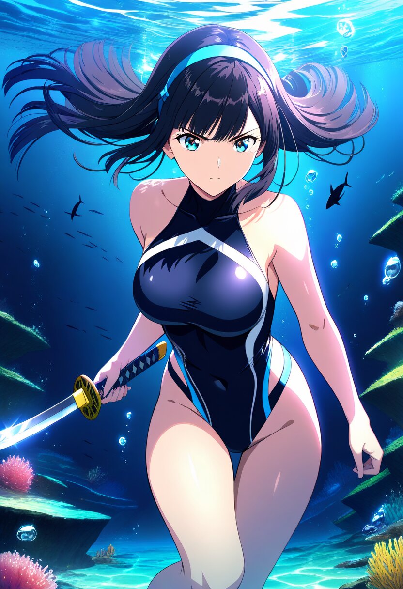 ((masterpiece)), ((best quality)), (ultra-detailed), anime style,cowboy shot, seafloor,underwater, submerged,midnight,a cute girl, 1girl, large bust ,(Black Racing-style swimsuit), beautiful black hair, ((beautiful eyes)),straight hair, (blunt hair), ((blue hairband)), (drifting underwater),Holding a weapon in hand, gripping katana,Serious