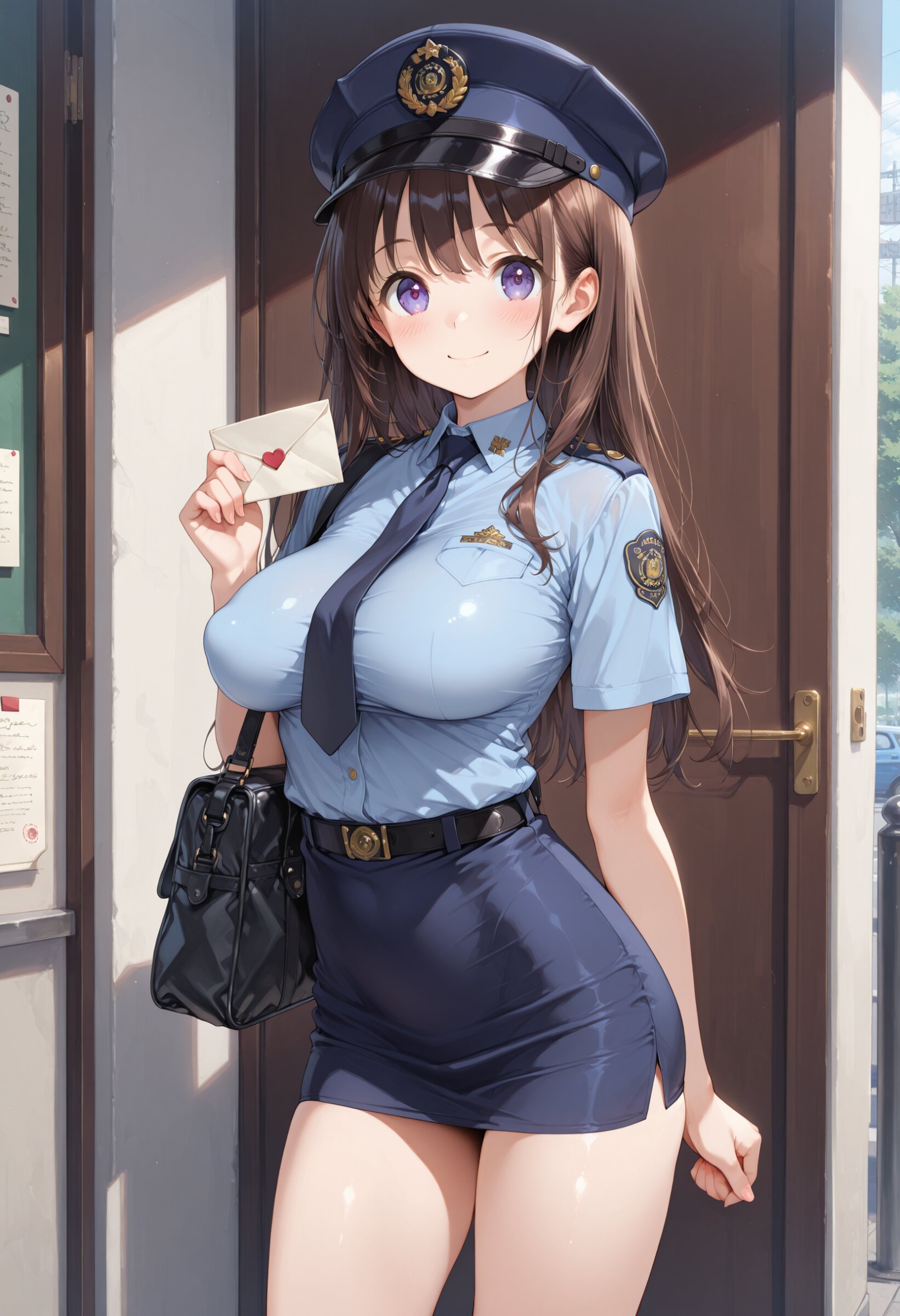 masterpiece, best quality, highres, ultra-detailed, extremely detailed, detailed, 1girl, loli, petite, beautiful hair, beautiful eyes, looking at viewer, post officer, big breasts, impossible clothes, perky breasts, slim legs, slim hip, happy, miniskirt, shoulder bag, (hold a stamped letter:1.2), cowboy shot,