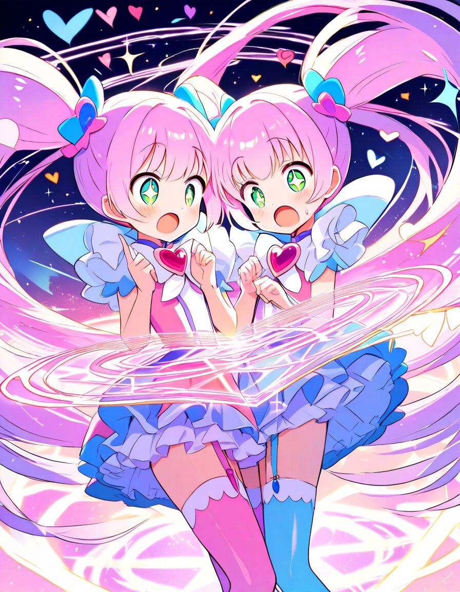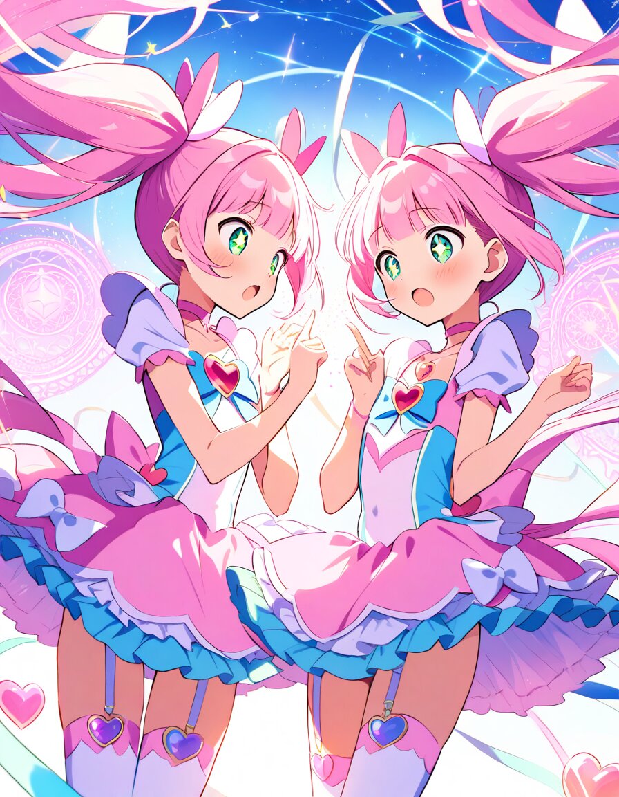 2girls, identical twins, petite loli magical girls standing side by side, facing each other, both pointing fingers at each other in shock, surprised expression, wide open eyes, open mouth :O, gasp, shocked face, very surprised, cute adorable kawaii face, flat chest, small breasts, slim narrow hips, very long legs, absurdly long vivid pink twintails, extremely long twintails down to thighs, thick flowing twintails, neat bangs, bright emerald green eyes, sparkling eyes, innocent features, classic frilly magical girl outfit, pastel pink and white layered dress, lots of ribbons and frills, heart-shaped motifs, heart-shaped magical staff in one hand, garter belt with garter straps, thighhigh stockings, sparkling glitter particles everywhere, glowing light particles, crackling magical energy sparks, enormous glowing magic circle floating behind them, magical aura, dynamic cowboy shot, dynamic angle, wind effect blowing hair and skirt dramatically, looking at each other intensely with surprise, masterpiece, best quality, ultra detailed, very aesthetic, vibrant pastel colors, magical girl atmosphere, kawaii, cute, sparkling, highres