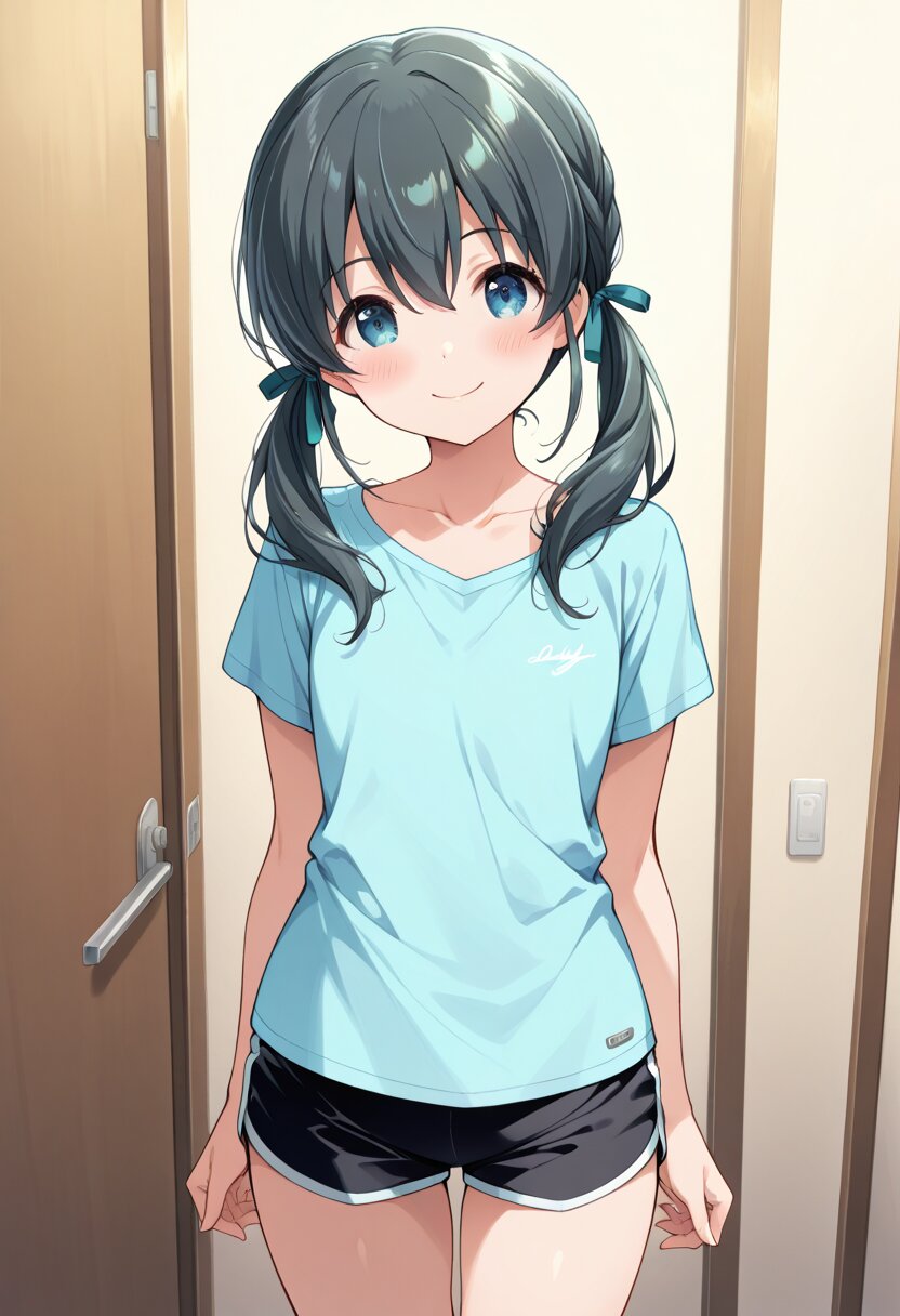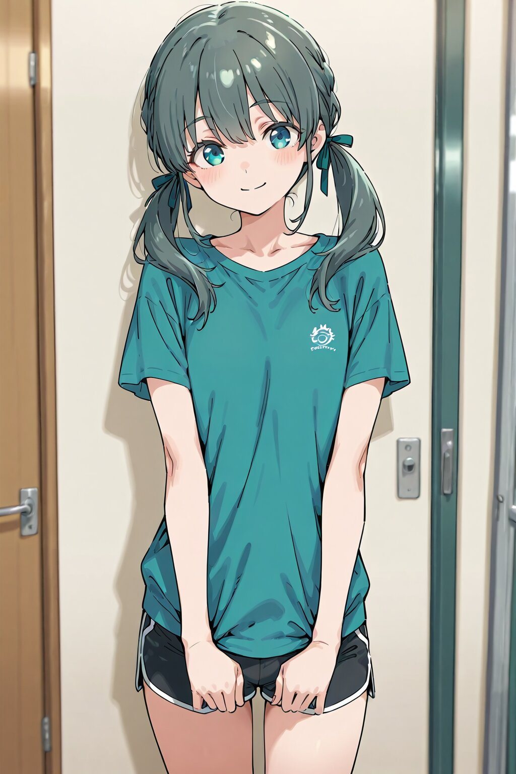 masterpiece,best quality,amazing quality,general, fine detail, official art, 1girl, cute face, The image shows a girl in a blue shirt and black shorts standing in a room with a wall behind her. 1girl, solo, cowboy shot, looking at viewer, blush, dark green black hair, twintails, low long twintail, twintail ribbons, (flat chest), blue eyes, hair between eyes, ((beautiful eyes)), blue green shirt, collarbone, black shorts with blue green line, dolphin shorts, short shorts, thighs, smile, closed mouth, ribbon, hair ribbon,