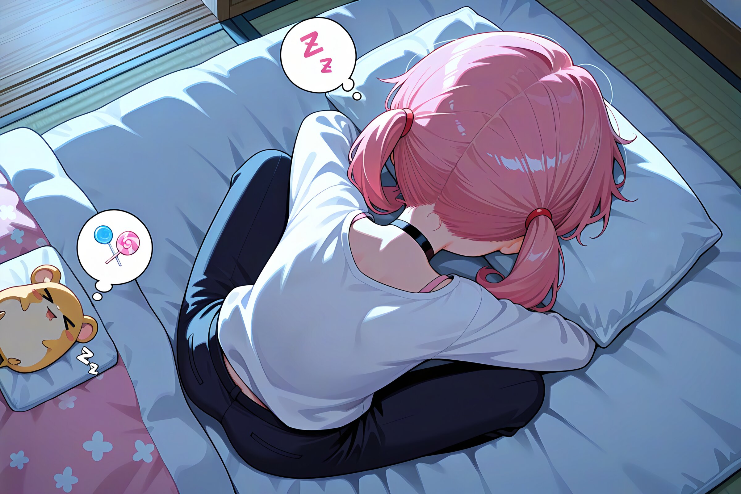 1 little girl, solo, from above, from back, masterpiece, best quality, amazing quality, very aesthetic, pink hair, twintails, sleeping, thought bubble, choker, white shirt, business pants, hamsters, > <, smile, open mouth, cheerful, saliva, spoken lollipop, futon, japanese room, night,