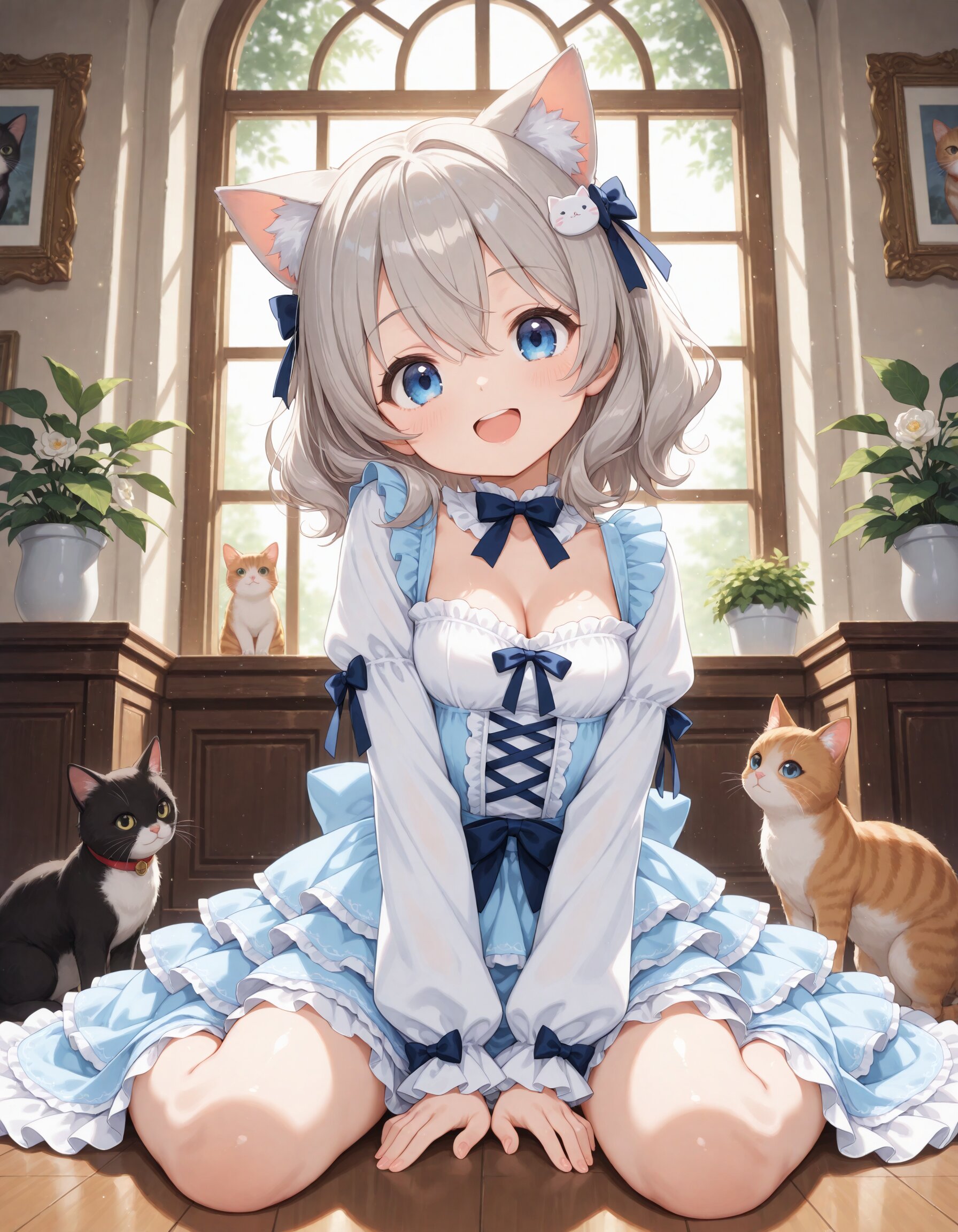 Depth of field, Dynamic angle, (A cute girl:1.1), (Loli:1.1), Solo, :D, Light blush, Wariza, Dynamic pose, (Head tilt:1.05), Looking at viewer, Cute round face, Blue eyes, Medium breasts, Medium hair, Wavy hair, Grey hair, Hair between eyes, Cat ears, Cat hair ornament, Sweet lolita, Cat themed dress, Long sleeves, Frilled sleeves, (Layered skirt:1.2), Long skirt, Cleavage, (Wind lift:0.7), Indoors, Mansion, Ivy, Decorative plants, Too many cats, Masterpiece, Best quality, Amazing quality, Very aesthetic, Absurdres, Highres, Hi res, Newest