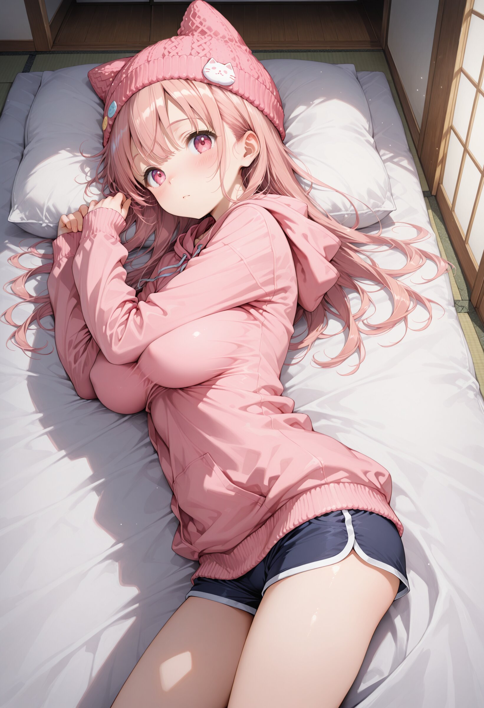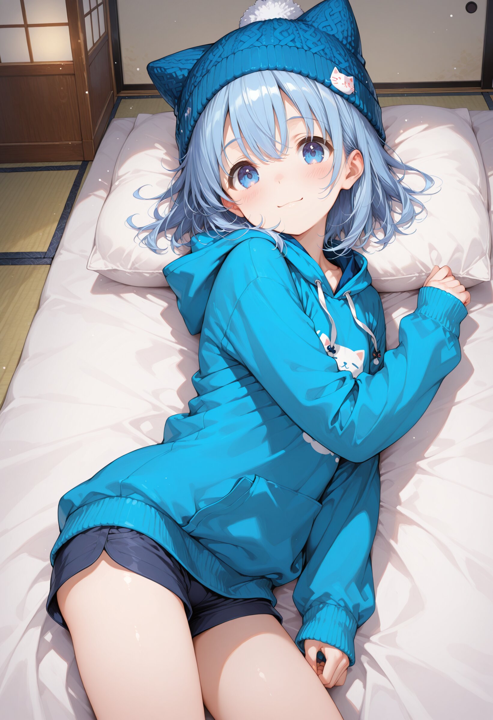 masterpiece, best quality, highres, ultra-detailed, extremely detailed, detailed, 1boy, shota, kawaii, light blue hair, medium hair, blue eyes, cat ear style knitted hat, blue hoodie, short pants, long sleeves, moe sode, Sleeves past wrists, slim legs, winter, japanese room, japanese shiki futon, sleeping, innocent expression, cowboy shot, from side, smile, look at viewer,