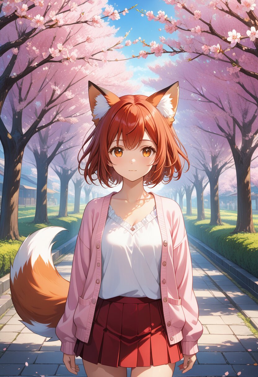 (high resolusion,illustration,ultra detailed 8k art,extremely detailed CG,official art,clothes reflecting light,detailed shiny skin,detailed background:1.3), ((highly detailed beautiful face and eyes),anime_style, red_fox_ears, girl, red_hair, short_hair, double_eyelids, long_eyelashes, fluffy_tail, cardigan, white_blouse, miniskirt, frills, sakura_trees, cherry_blossom_avenue, outdoor_scene, full_body, standing_pose, clean_composition, soft_shading