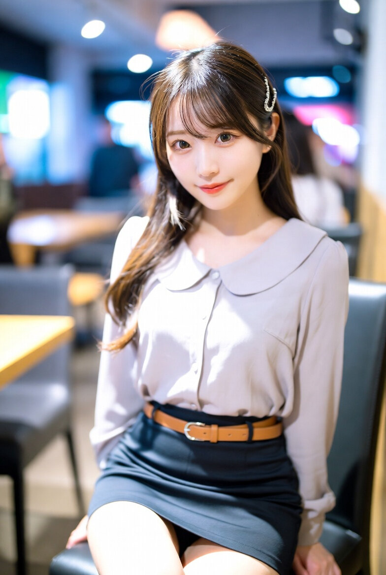 日本人女性23歳のリアルな写真、プロのカメラマンによる撮影テクニック。 ロングヘア、耳にアクセサリーをつけている。ページュ色で首元まで襟があるブラウスと、濃い色のタイトなミニスカートと茶色のベルトを身につけている。背景は喫茶店。イスに腰掛けている。 屋内照明、優しくこちらに微笑んでいる。