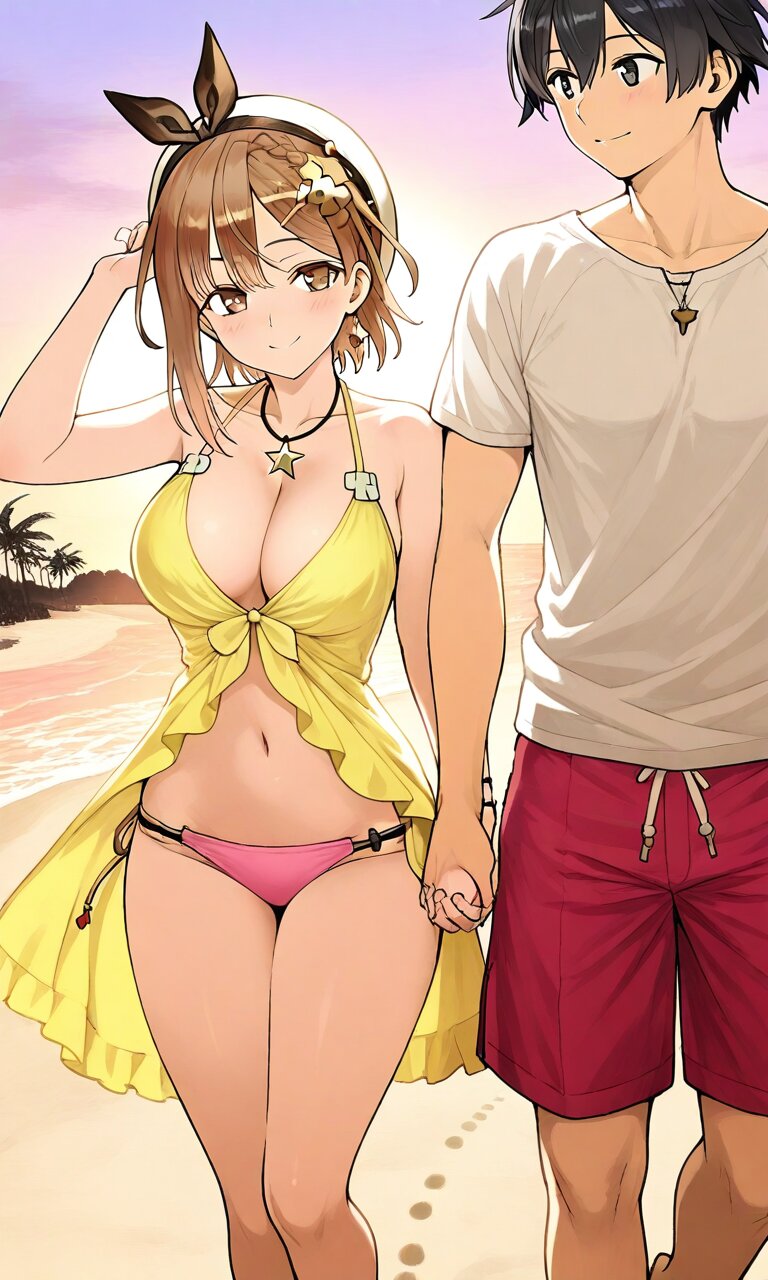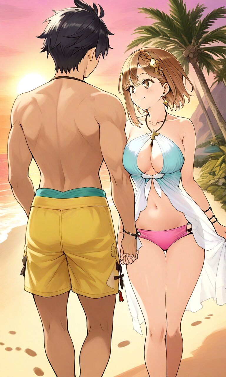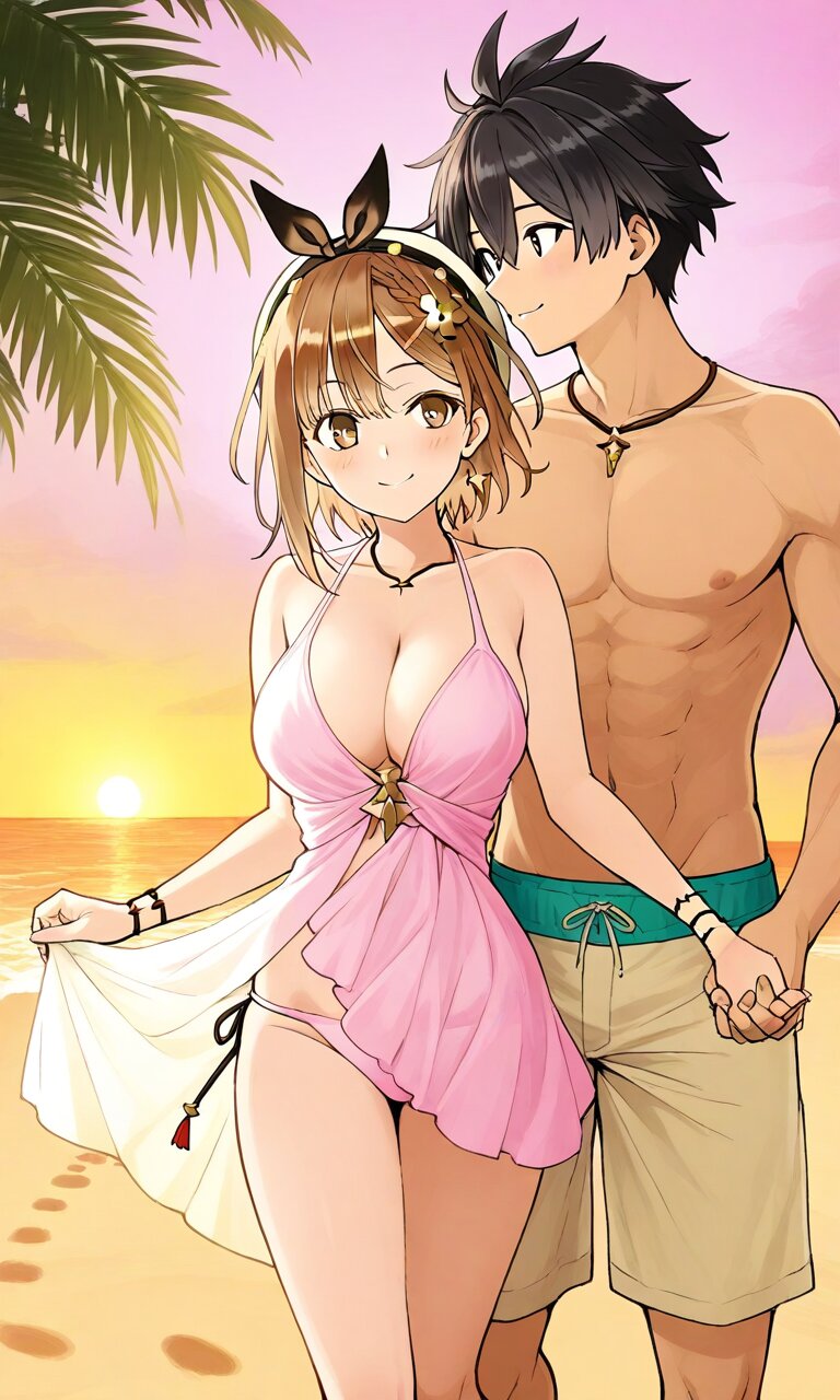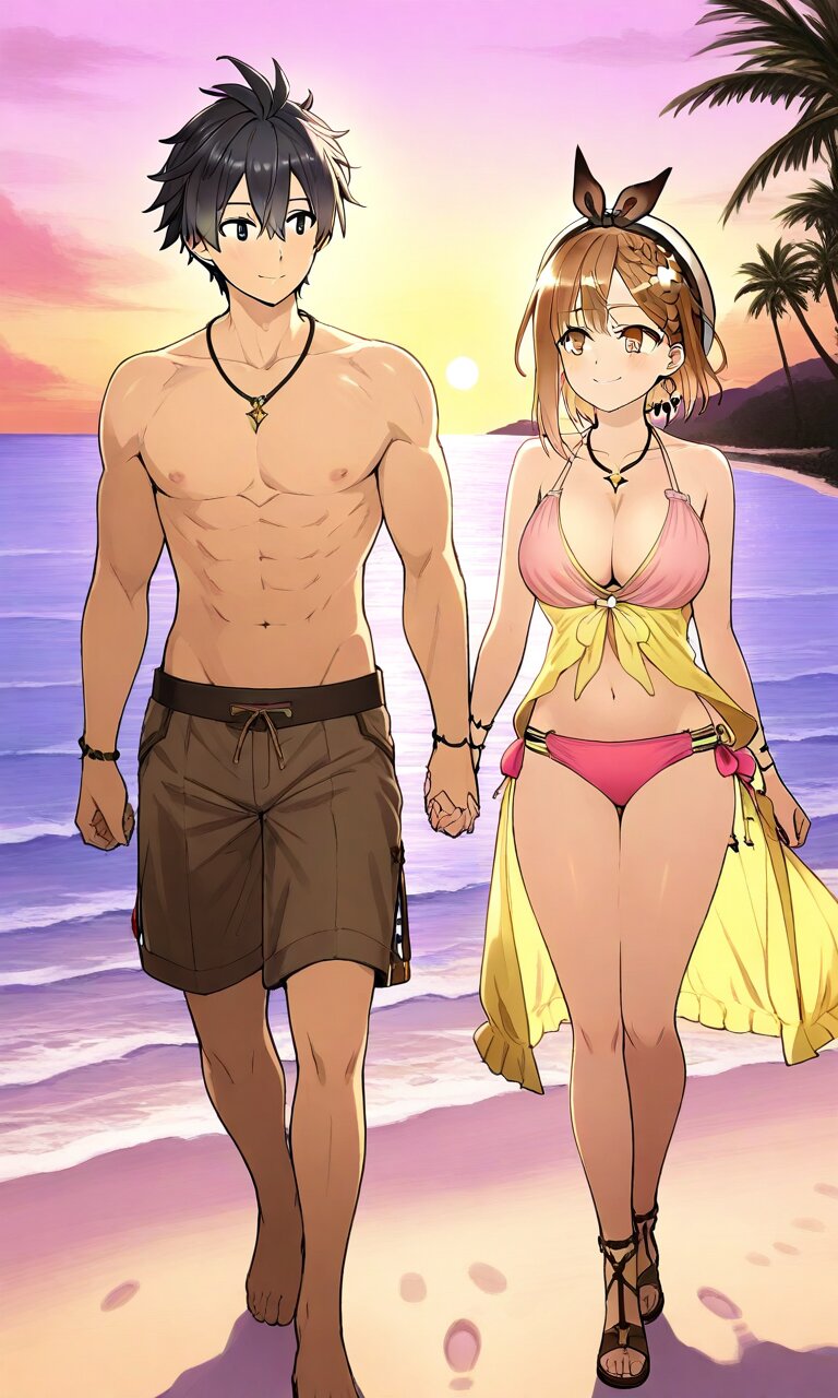 Couple, boy and girl, two people only,absurdres, ultra-detailed, master piece, high resolution, 8k, Boy, girl, couple, romantic couple walking on Hawaiian beach at sunset, holding hands, silhouettes against vibrant orange pink sky, turquoise ocean waves, palm trees, footprints in sand, woman in flowing dress or bikini, man in shorts, intimate loving gaze, golden hour lighting, tropical paradise atmosphere, ultra detailed, masterpiece, best quality, BREAK the boy(original boy,black hair,short hair, black eyes) BREAK the girl(reisalin stout, large breasts, ),