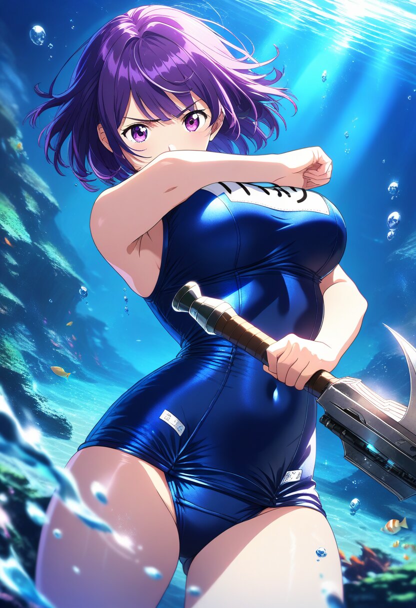 ((masterpiece)), ((best quality)), (ultra-detailed), anime style,cowboy shot, seafloor,underwater, large bust,(school swimsuit), navy blue, short hair, purple hair, Holding a weapon in hand, gripping Battle Axe,Dynamic Pose